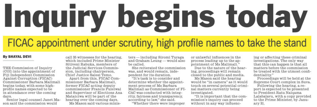 Today’s Fiji Times report as the Barbara Malimali inquiry begins its secret hearing with Barbara Malimali still the FICAC Commissioner. Unbelievable.