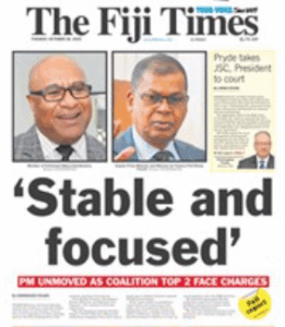 Today's Fiji TImes carries easily one of the most ludicrous front page headlines in the entire 156-year history of the nation's favourite fish wrapping - "Stable and focused", it proclaims, quoting the Prime Minister about his government, when the whole country can see that it is neither stable nor focused and instead, is in a state of catastrophic … [Read more...] about # THE COALITION GOVERNMENT TRIES TO SPIN ITS WAY OUT OF CATASTROPHE (UPDATED TUESDAY EVENING)