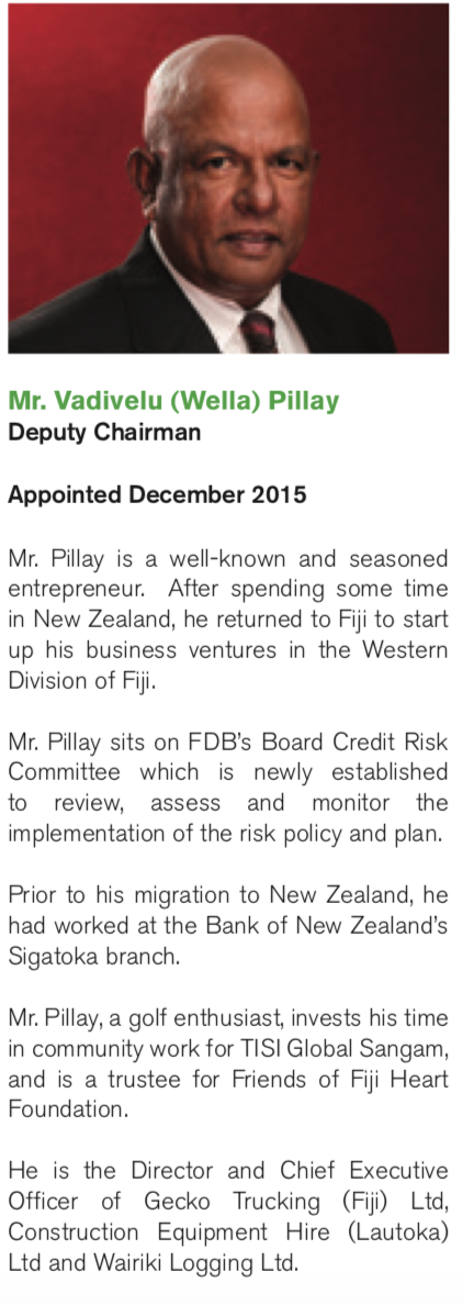 Here’s Wella Pillay’s CV extracted from an annual report of the Fiji Development Bank. He has reportedly since diversified into the barge business, assisting Ratu Tevita to tackle the dire shipping shortfall in Lau.