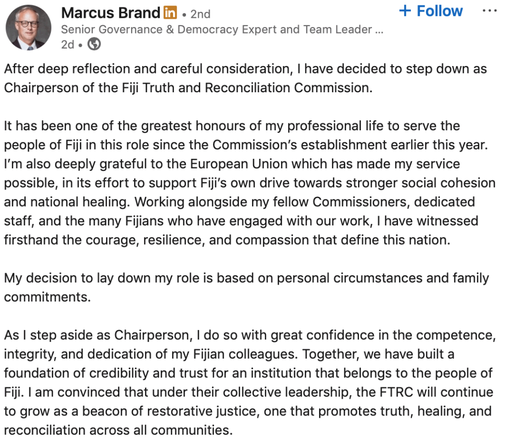 And the official reasons Dr Marcus Brand has given for abandoning his post as Chair of the Truth and Reconciliation Commission.