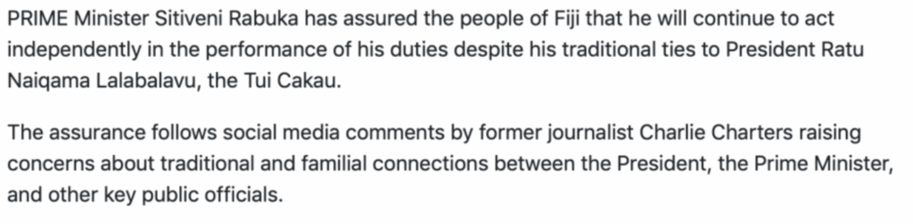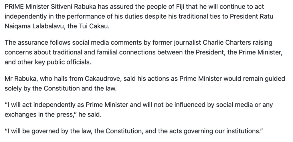 You can bet your bottom dollar that Charlie’s reference relates less to the Prime Minister’s relationship with the President – which is old news – than to the fact that he installed one of his relatives, Lavi Rokoika, as FICAC Commissioner. And Rokoika – horror of horrors – is going after Charlie’s gang, starting with Manoa Kamikamica and ending up who knows where.