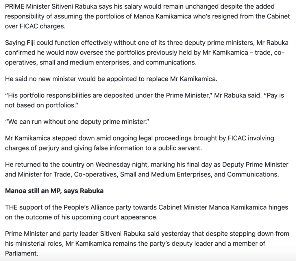 2/ The second is the mooted application by Wylie Clarke – on behalf of Manoa Kamikamica – for a permanent stay on the FICAC prosecution of the now stood-aside deputy prime minister. Clarke is claiming that the Prime Minister didn’t have the legal right to appoint Lavi Rokoika as FICAC Commissioner. That – as Grubsheeet has explained – is nonsense. But it is a complex legal argument that needs to be fought hard and with the best legal brain the state can afford.
