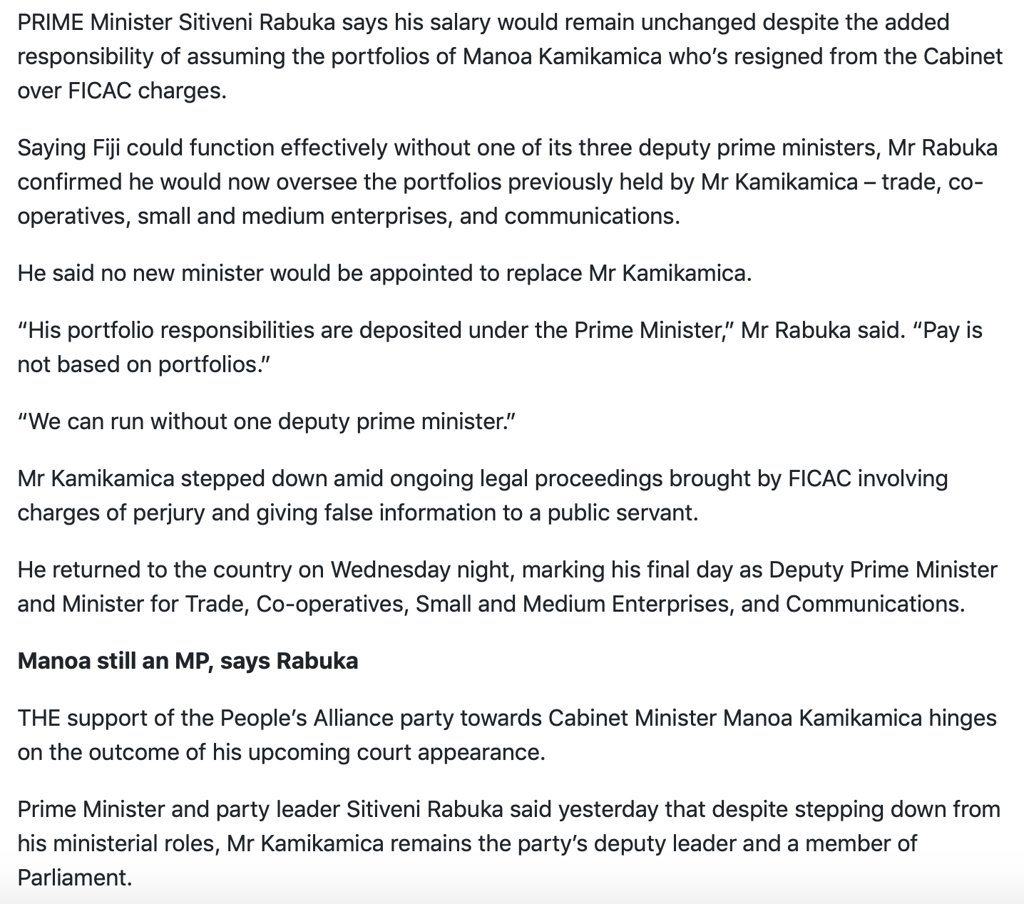 So Manoa Kamikamica is not leading a faction intending to split from the People’s Alliance if he doesn’t get the leadership? As your matanivanua on this one and given your personal contacts, perhaps you could answer that question for the benefit of our readers.