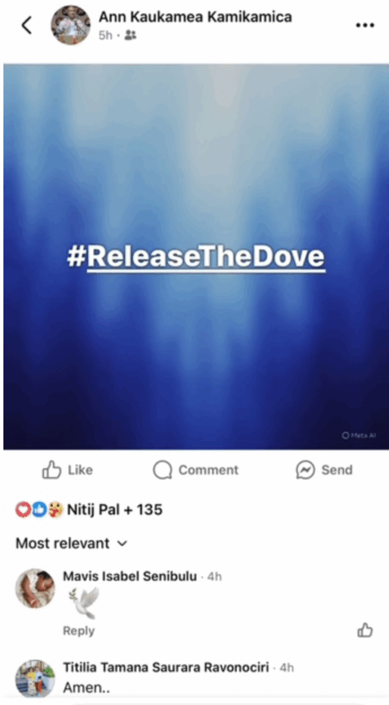Did you consider release the Dove relates to Tailevu, participating in the Skipper Cup SF on Saturday? See other of her posts that same day about Tailevu rugby. The dove is basically the Tailevu rugby logo.
