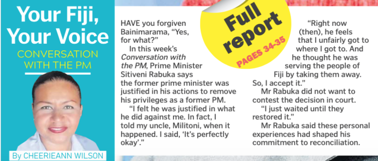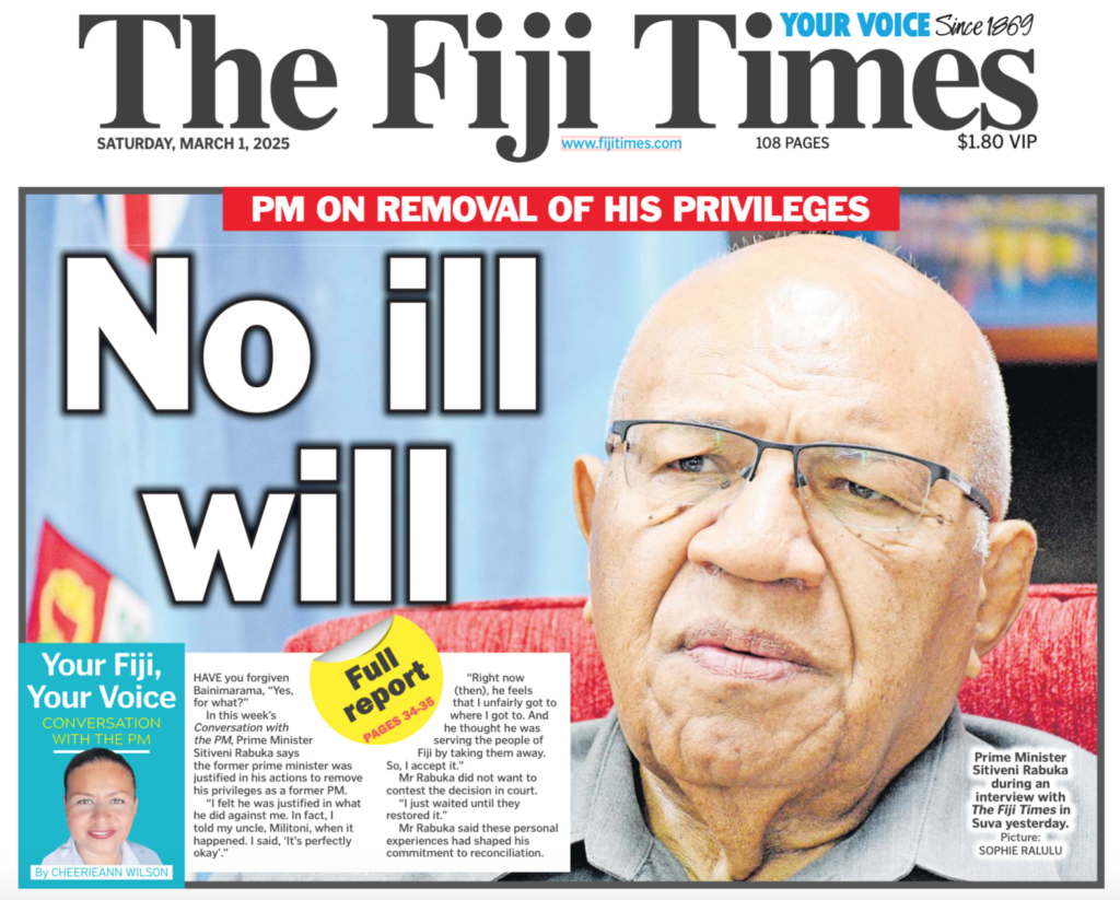 But let’s just start with the Fiji Times front page and go from there – another pathetic non-story from the Prime Minister’s resident handmaiden, Cheerieann Wilson, that is not only totally un-newsworthy but not even current, let alone future looking. Just more raking through the spent coals of the relationship between Sitiveni Rabuka and Frank Bainimarama, casting the Prime Minister yet again as someone who has forgiven his old adversary. Journalistic rubbish of the first order.