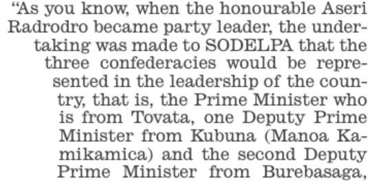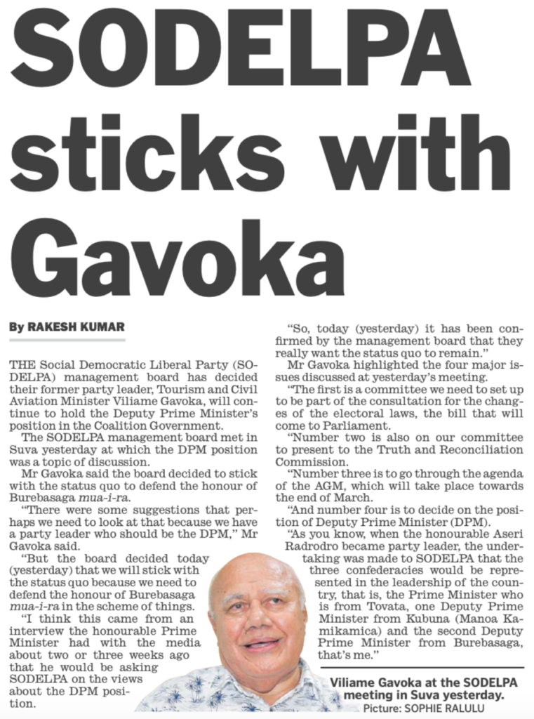 Then a real doozy on the same page – “Blinky Bill” Gavoka stays as Deputy Prime Minister when he is no longer SODELPA leader not because his successor, Aseri Radrodro, is a domestic violence abuser who almost killed his former wife, the Prime Minister’s daughter, and had a “brutal” illicit sex session with Lynda Tabuya in Room 233.