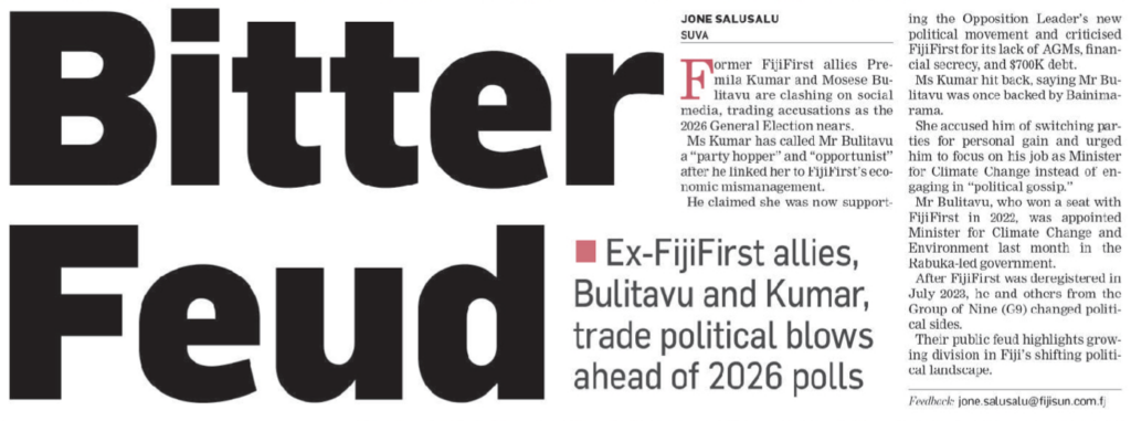 Over at the Fiji Sun, it’s the same story – a front page in which “Mad Mo” Bulitavu and sensible Premila Kumar go toe-to-toe in a championship bout of finger pointing.