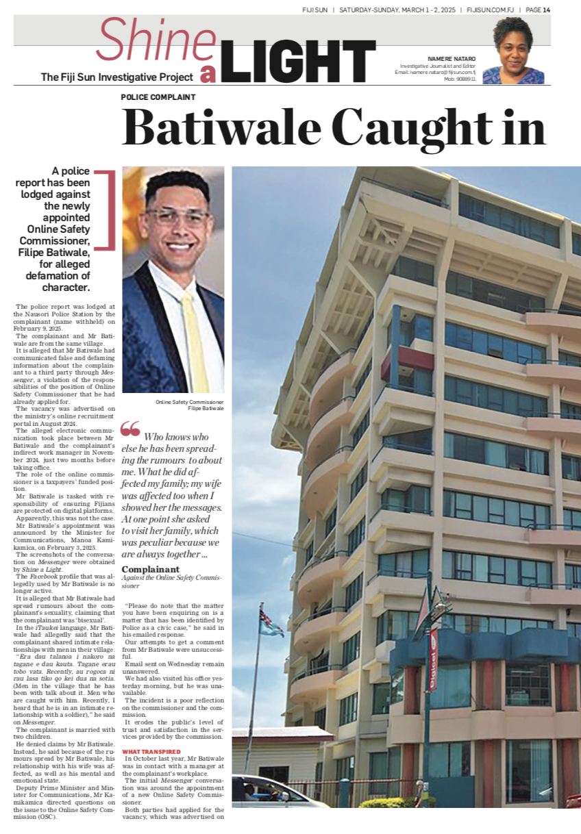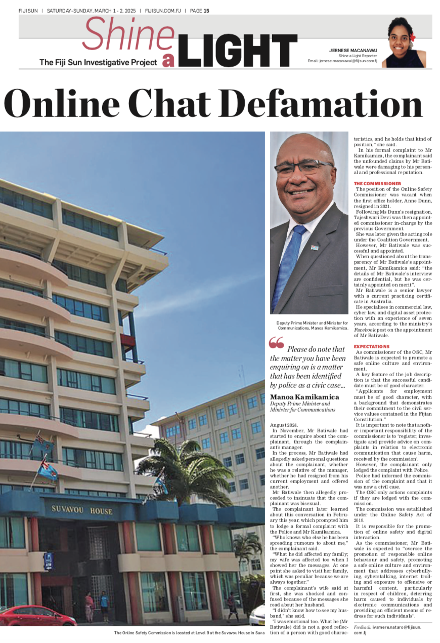 He specialises in commercial law, cyber law, and digital asset protection with an experience of seven years, according to the ministry’s Facebook post on the appointment of Mr Batiwale.” Fiji Sun.