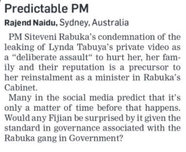 The joke’s on you, mate. Lynda is front page of today’s Fiji Times with an entire inside feature on the scandal. So I am not exactly an island in this sea of veka. Except that I am on dry land and you are swimming in it. What a juvenile comment.