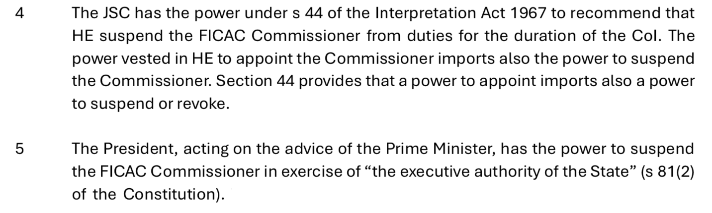 Now by way of background, the full advice from Professor Philip Joseph KC that Grubsheet first published nine days ago establishing once and for all both the JSC’s power to suspend the FICAC Commissioner and the right of the Prime Minister to advise the President to do so.