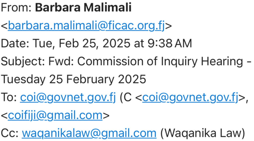 Yesterday we learnt of an email Malimali sent the Commission of Inquiry on Tuesday that demonstrates conclusively that far from being on “leave”, she is acting as if nothing has happened. She is still calling the shots at FICAC and still interfering with the COI proceedings.