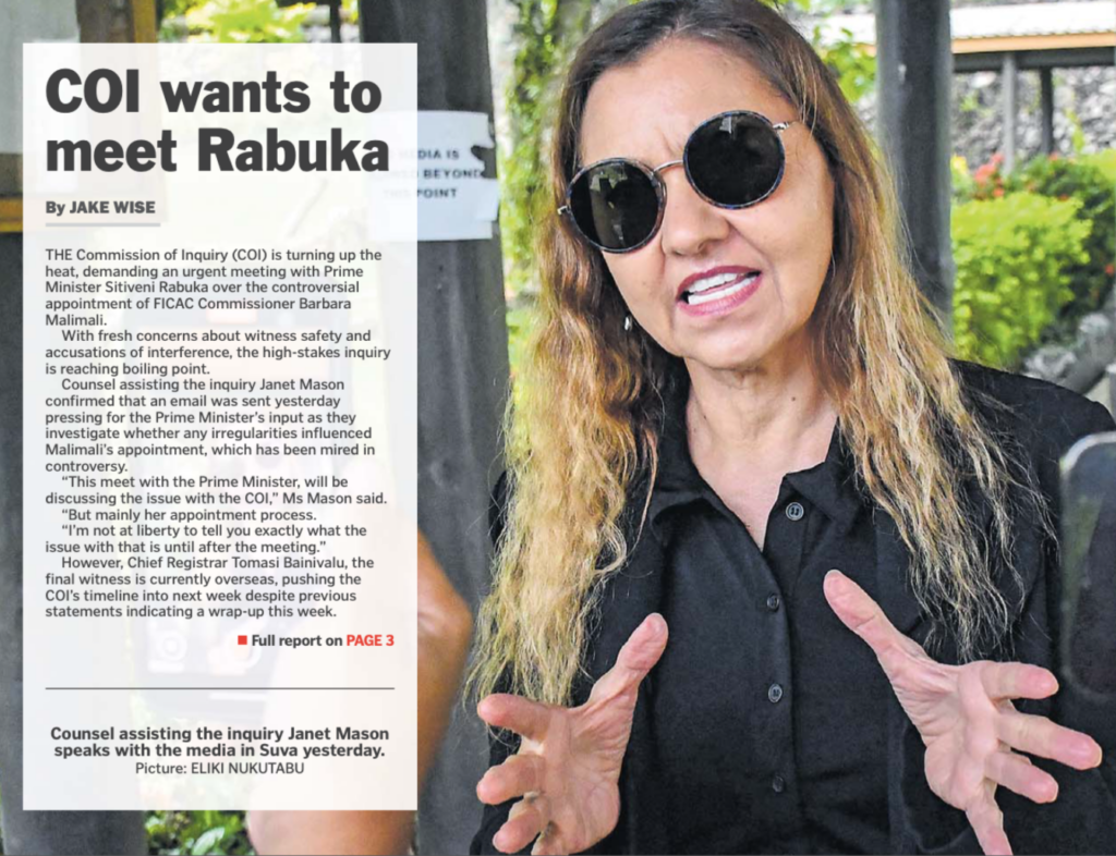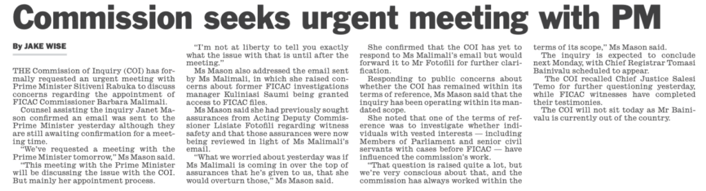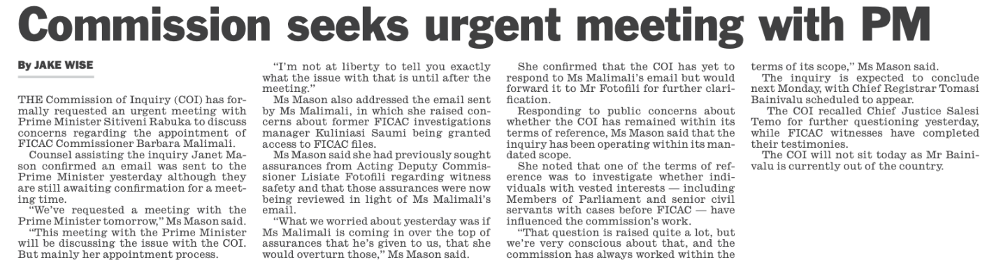 The Commission of Inquiry into the appointment of Barbara Malimali as FICAC Commissioner has sought an urgent meeting with the Prime Minister, Sitiveni Rabuka, as its demand for the suspension of Malimali to protect FICAC witnesses from intimidation continues to be ignored.
