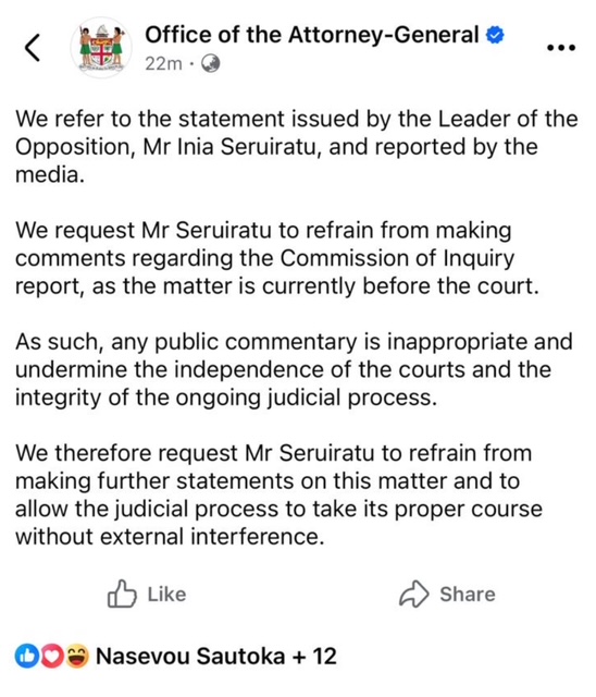 There is very little opposition since the implosion of FF, and now what opposition there is is gagged under a choke hold. Next we will see CJ trying a Tabuya trick and maybe he will call Totogo and see if he can get Inia under the cyber bullying nonsense. But wait, did Inia do it on Fb or Tiktok or just in Parliament where the privilege applies? Or is it just the Acting AG who is annoying people with his online comments? Maybe Acting AG should not go online to bully Inia, but stick to Parliament where all indiscretions of speech are covered by privilege.