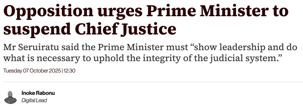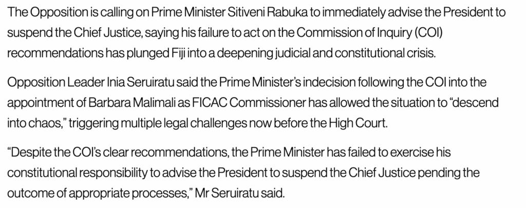 Salesi Temo’s position as Chief Justice is untenable and the calls for his removal have come from across the political spectrum – Inia Seriratu as the formal Opposition Leader, other parliamentary opposition figures such as Jone Usamate, Premila Kumar and Ketan Lal and from outside the parliament, the leaders of the Labour and Unity parties, Mahendra Chaudhry and Savenaca Narube. This is democracy at work, the opposition doing its job of holding the government and those who occupy our offices of state to account.