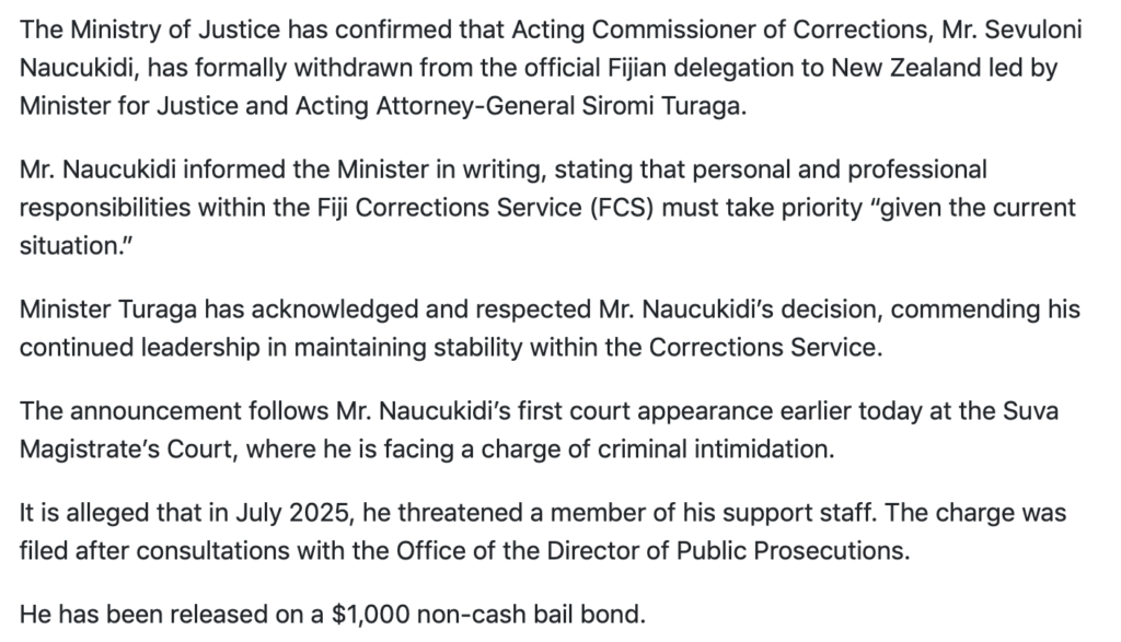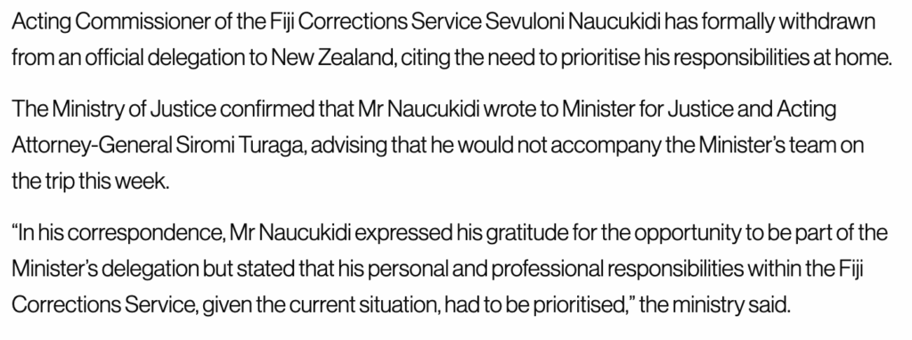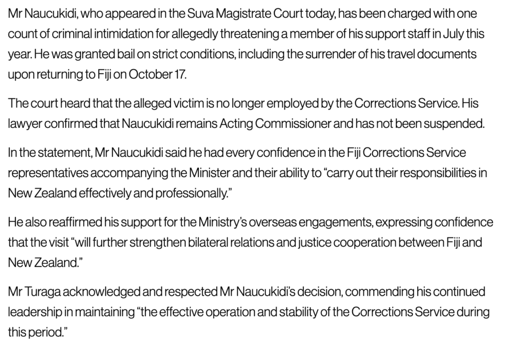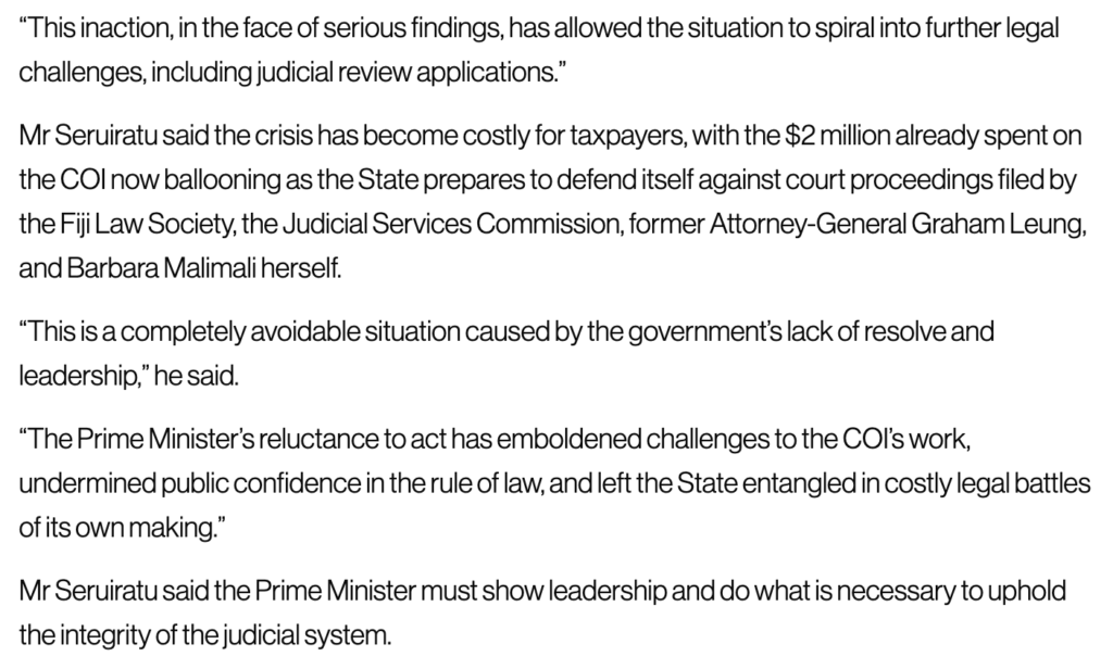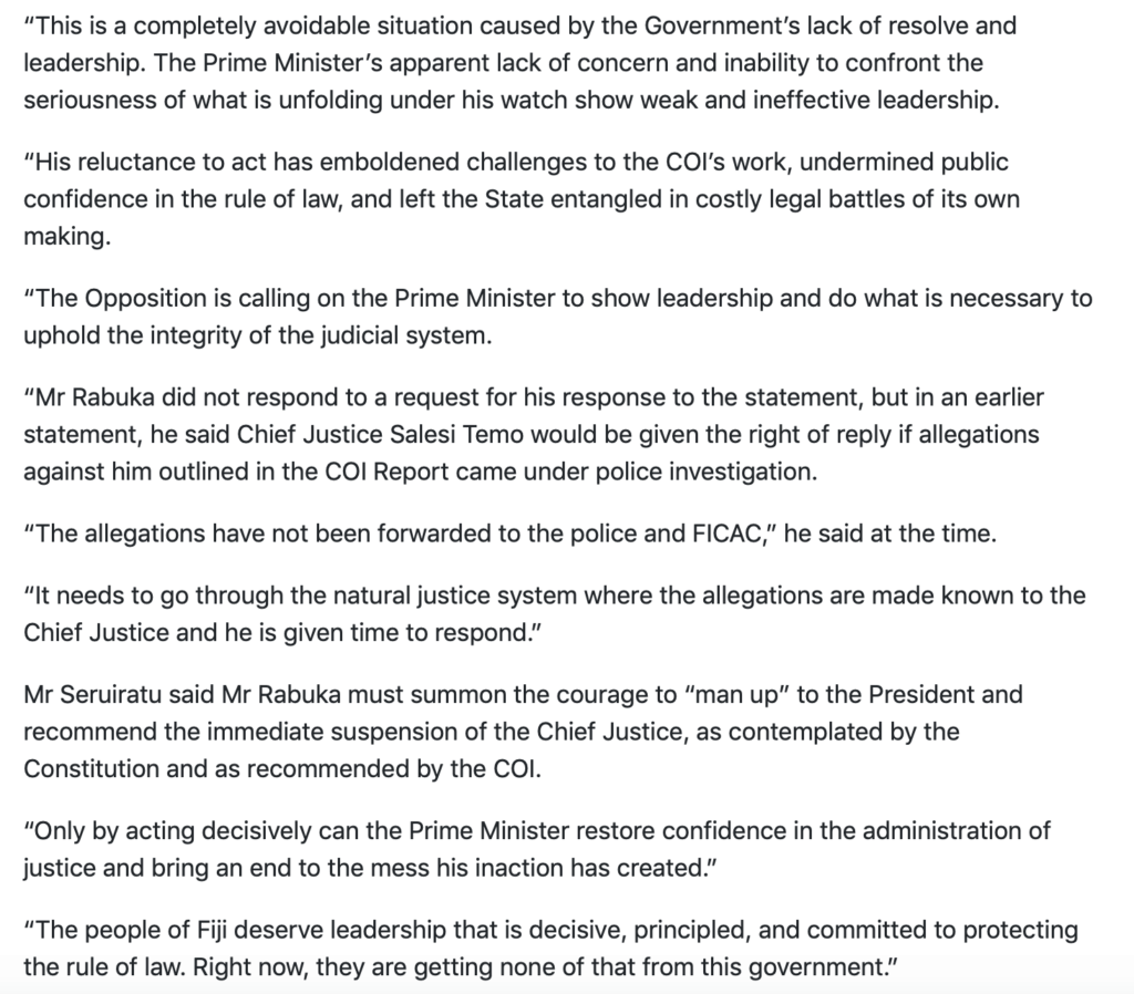 It is a travesty of justice that must not be allowed to stand. And the Opposition both in the parliament and those political leaders outside it not only have a right to demand that Temo be suspended, they have a duty to do so on behalf of the Fijian people. And in the face of a government that is going increasingly rogue and thinks it can disregard the most basic standards of governance that apply in any functioning democracy.