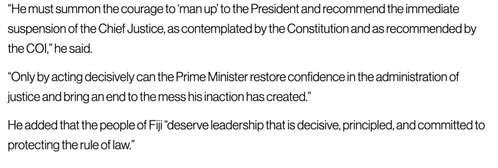 Yes Prime Minister, as the Opposition leader says, it is time for you to “man up” and do your duty to remove Salesi Temo as Chief Justice. Stop behaving like a frightened mongoose in the headlights and do your job. And tell your goons like Siromi Turaga and Temo’s goons like Isireli Fa to back off.