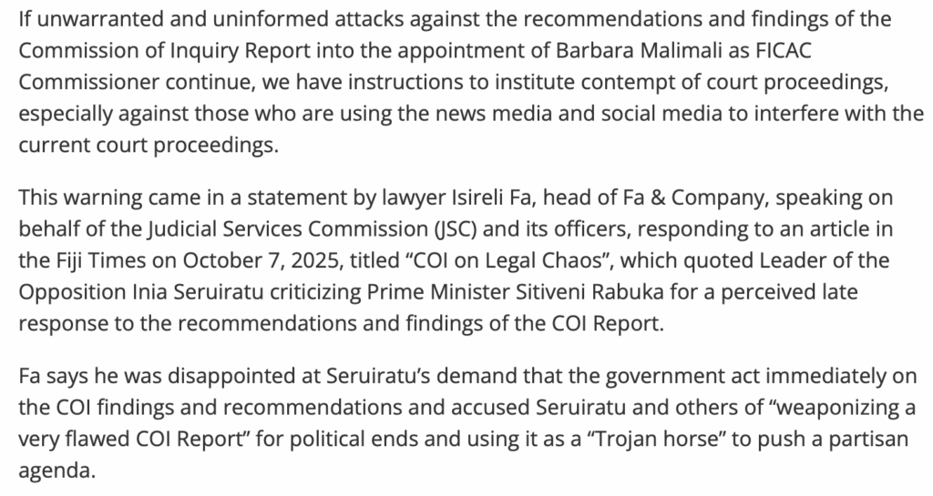 Yet now the government through the Acting Attorney General, Siromi Turaga, and Salesi Temo’s lawyer, Isireli Fa, are trying to gag the Opposition with threats of legal action if they don’t lay off the Chief Justice. The Fijian people must side with Inia Seruiratu and the other political leaders to fight this attempt to silence their legitimate demands that Temo be stood aside until the allegations against him are determined.