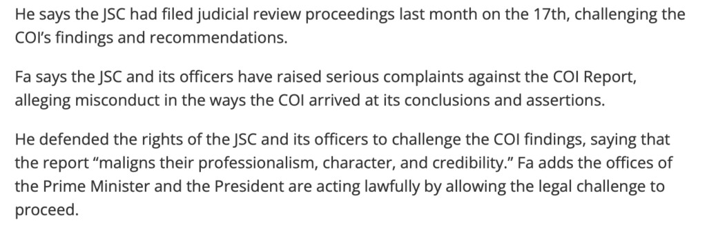 The assault on Justice Ashton-Lewis is a concoction to divert attention away from the COI findings, none of which have been publicly disputed. They don’t alter a damn thing. The legal position is simple. You can seek judicial review if you have been charged with an offence. But not just because you’ve received an adverse mention in a COI Report. The entire premise of these applications is wrong, which is a fact that will emerge in due course. But in the meantime, Temo must go to preserve the integrity of the judiciary as a whole.