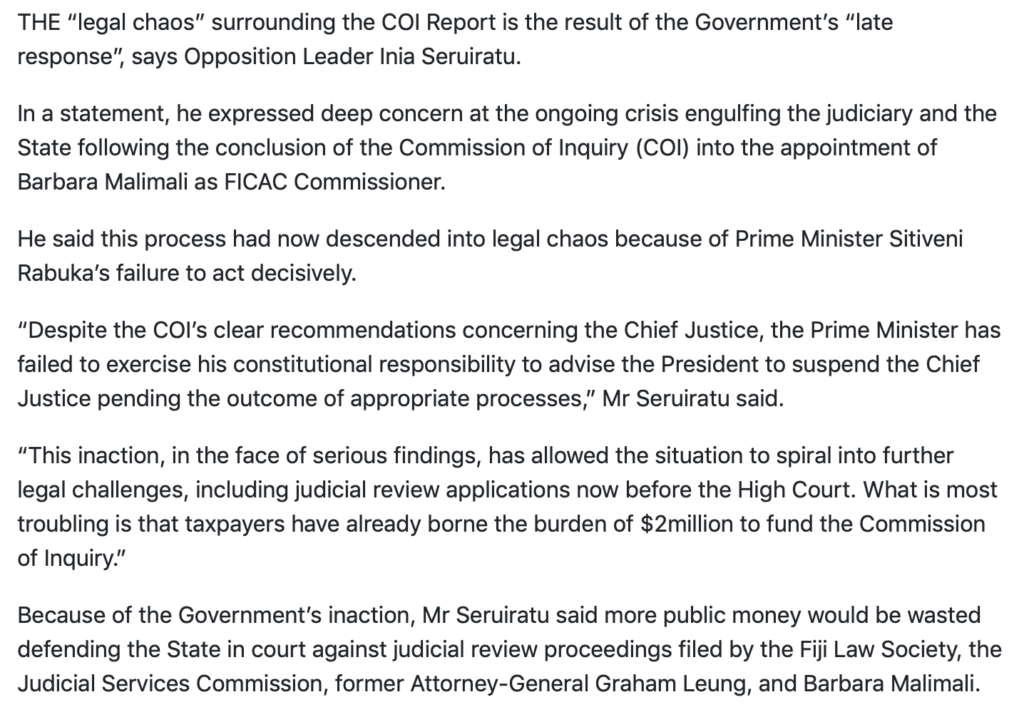 And why should the Fijian taxpayer be funding the CJ’s case in the first place? It is a finding against him personally (plus the finding against the Chief Registrar, Tomasi Bainvalu) It is not a finding against the JSC and the JSC has no cause to apply for a judicial review. Something that will also emerge in due course.