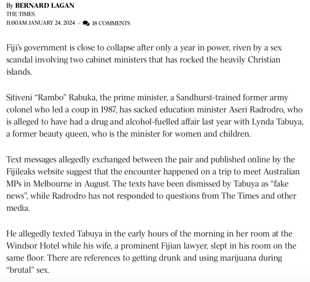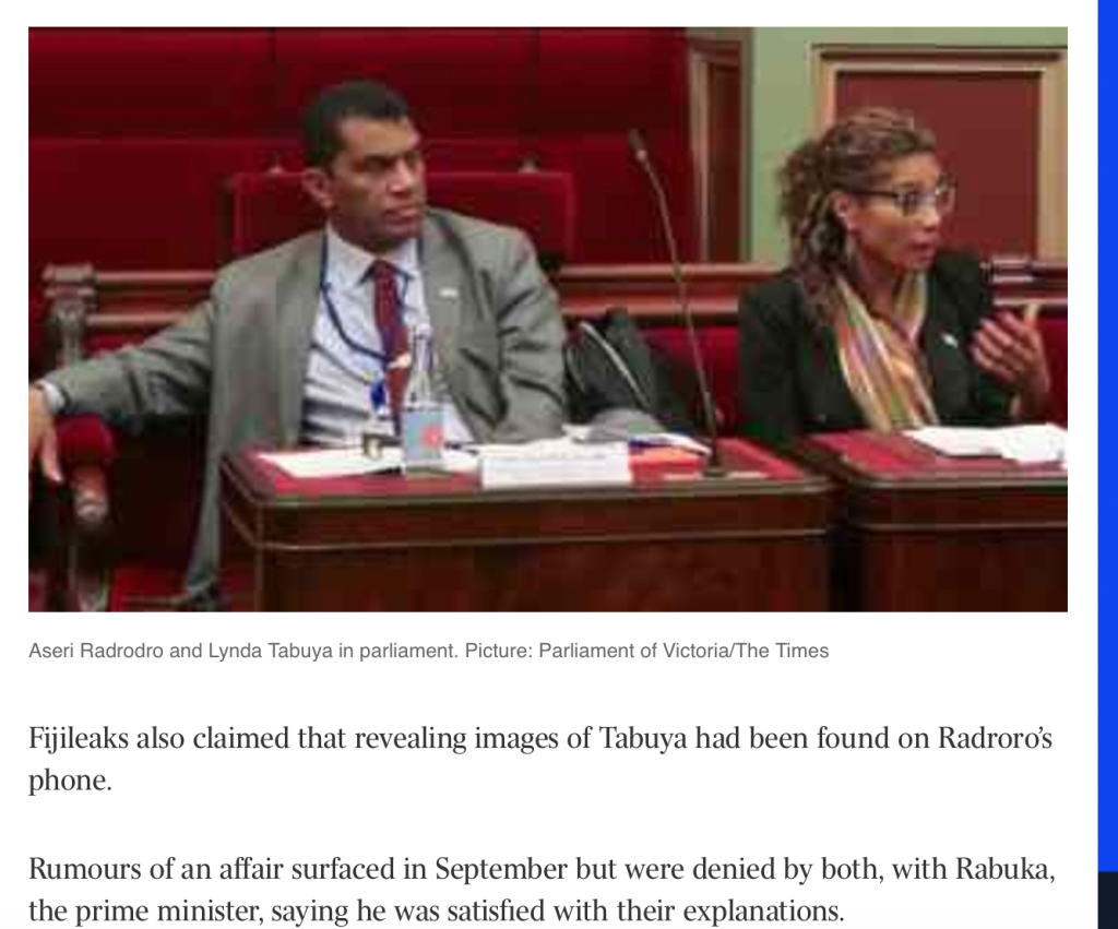 The venerable Times of London does what the Fiji Times refuses to do – report the sex and drug scandal involving Aseri Radrodro and Lynda Tabuya that has enveloped the Coalition government but is being mostly ignored in the Fijian media.