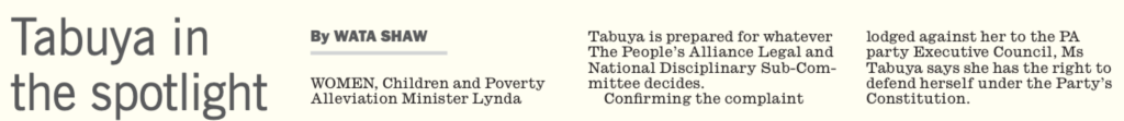 This scandal can no longer be shoved under the collective mat and there is no way that the current PAP inquiry into Lynda Tabuya’s conduct can produce a whitewash. If it does, then this is a story that will haunt the Coalition government all the way to the next election and cruel any chance of Manoa Kamikamica, or anyone else, being able to create a “fresh start” for the PAP.