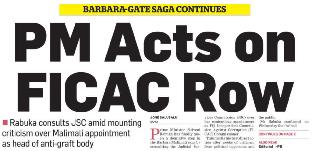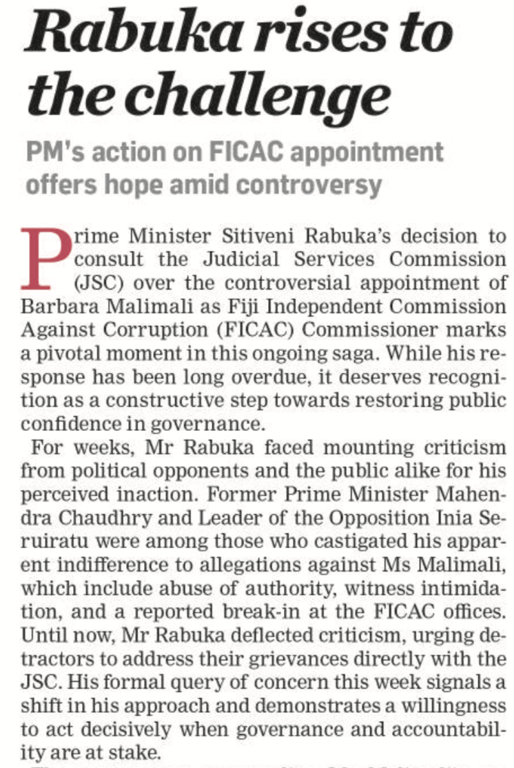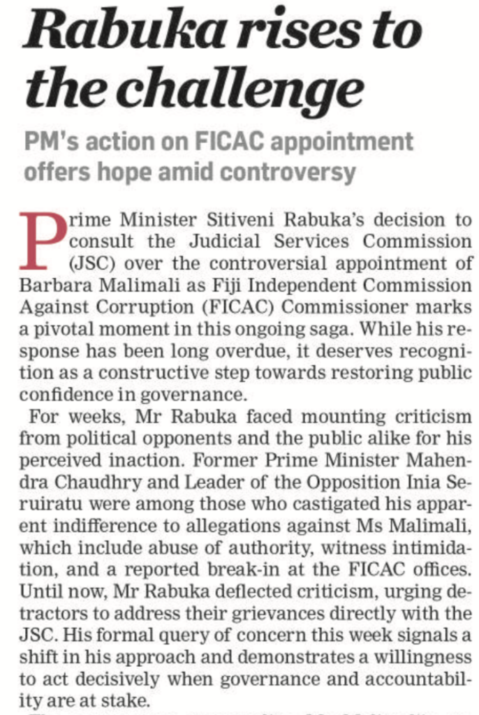We are also finally seeing the potential of an opposition that has been far too docile finally flexing its muscles to say that enough is enough. The Opposition Leader, Inia Seruiratu – who leads the “Group of 16” former FijiFirst MPs in the parliament – says Barbara Malimali’s position is untenable and she must be suspended. And that’s precisely what must happen if the Prime Minister and the Acting Chief Justice are to be consistent with what happened to the DPP, Christopher Pryde.