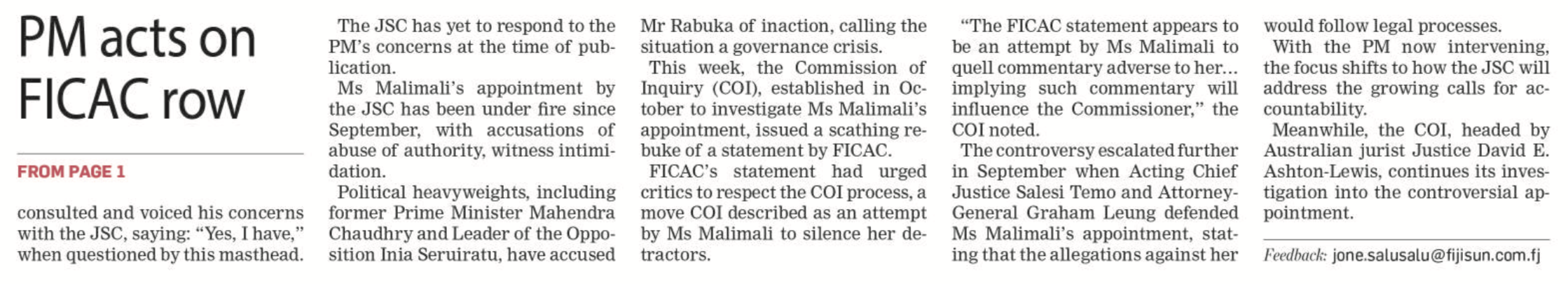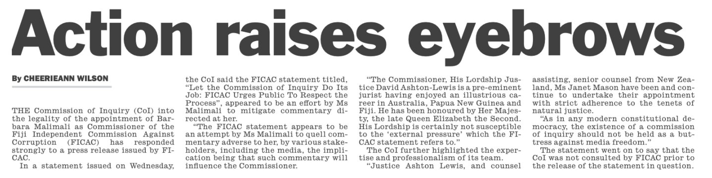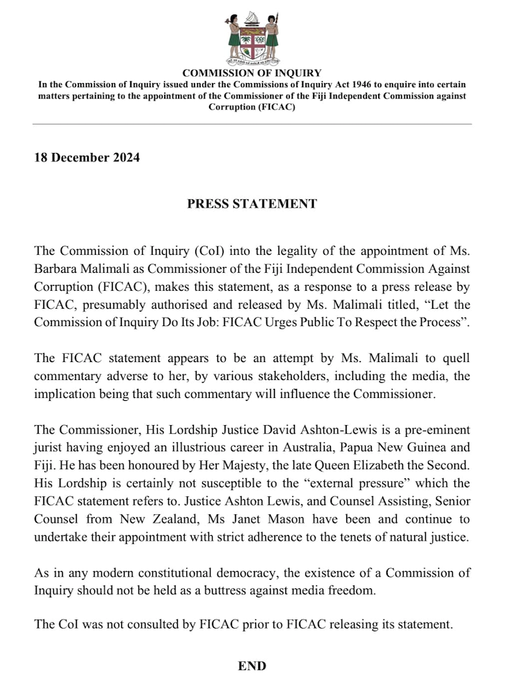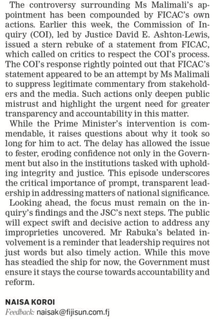 The secret to the Commission of Inquiry of the Malimali FICAC appointment is found in the Prime Ministers press statement that he received Malimali’s resignation as Chair of Electoral Commission from the Solicitor General Mr. Green on Saturday morning over two weeks after her appointment at FICAC. The digital footprint of the backdated resignation proves that she concocted the resignation after her appointment and colluded with Mr. Green to lie to Rabuka, that is what he meant by the rotten appointment. She was holding the position of Chair Electoral Commission and may have got paid for those two weeks too, double dipping. Lets hope she refunded the money then not now after reading this. You cannot be both the Chair of Electoral Commission and Commissioner of FICAC at the same time. One appointment is invalid.