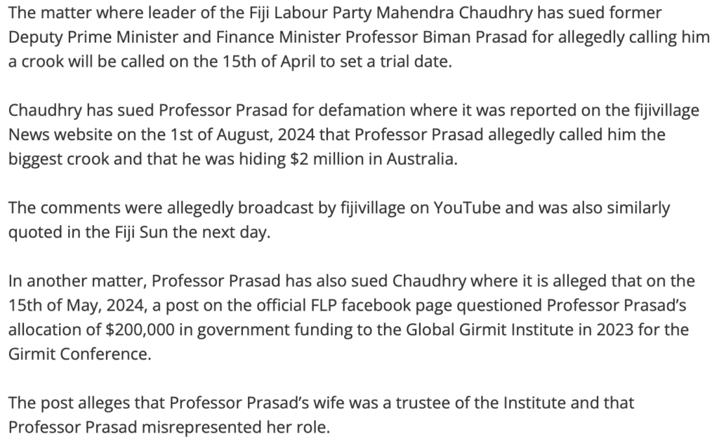We have to assume that Biman Prasad won’t be calling Inia Seruiratu as a character witness. But none of this does him any good in persuading a judge that he is a paragon of virtue with an unassailable reputation, no matter how much Richard Naidu tries to confine the case to the alleged libel itself.