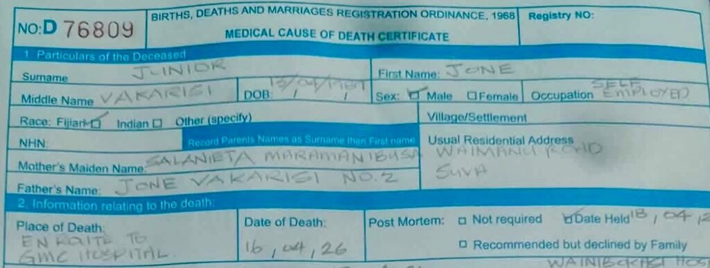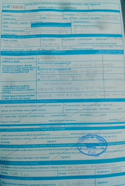 Here is Jone VakarisI’s full death certificate – a shocking document that demands the government’s immediate attention and response.