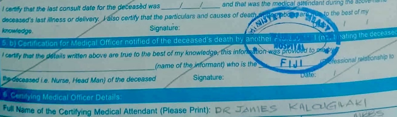 Nonsense. It is all there in the death certificate signed by a state medical practitioner with the official stamp of the Ministry of Health. Set it against the risible statement by the RFMF Commander and it is all the evidence we need.