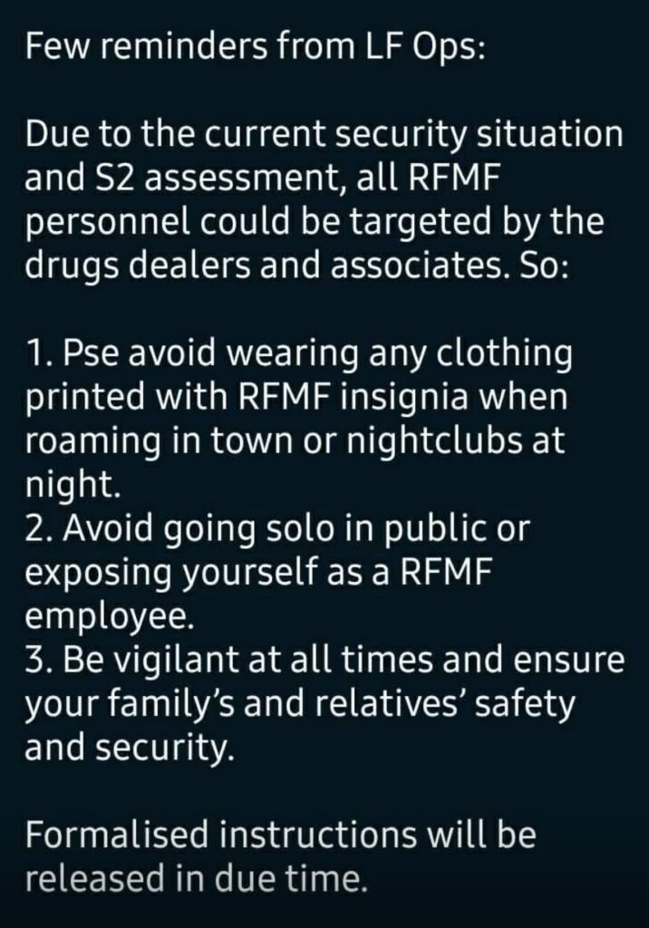 The RFMF is clearly anticipating retaliation from elements in the drug trade for the killing of Jone Vakarisi, judging from the following message to all personnel from Land Force Operations.