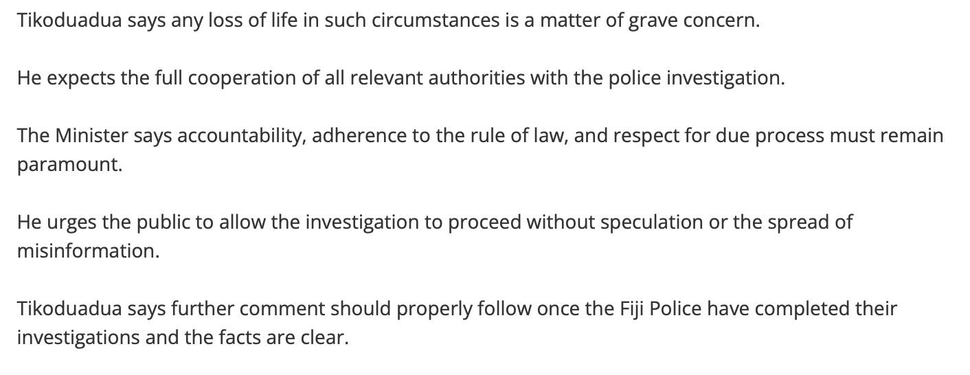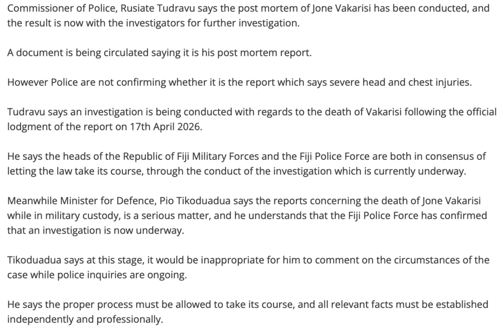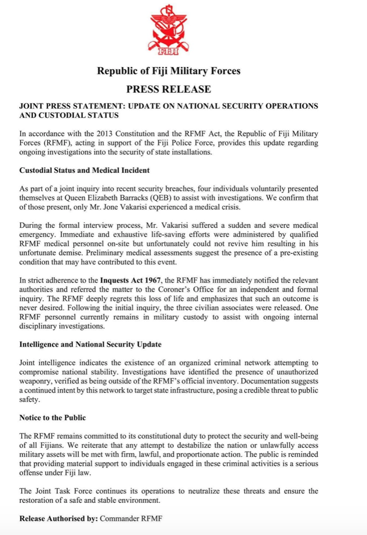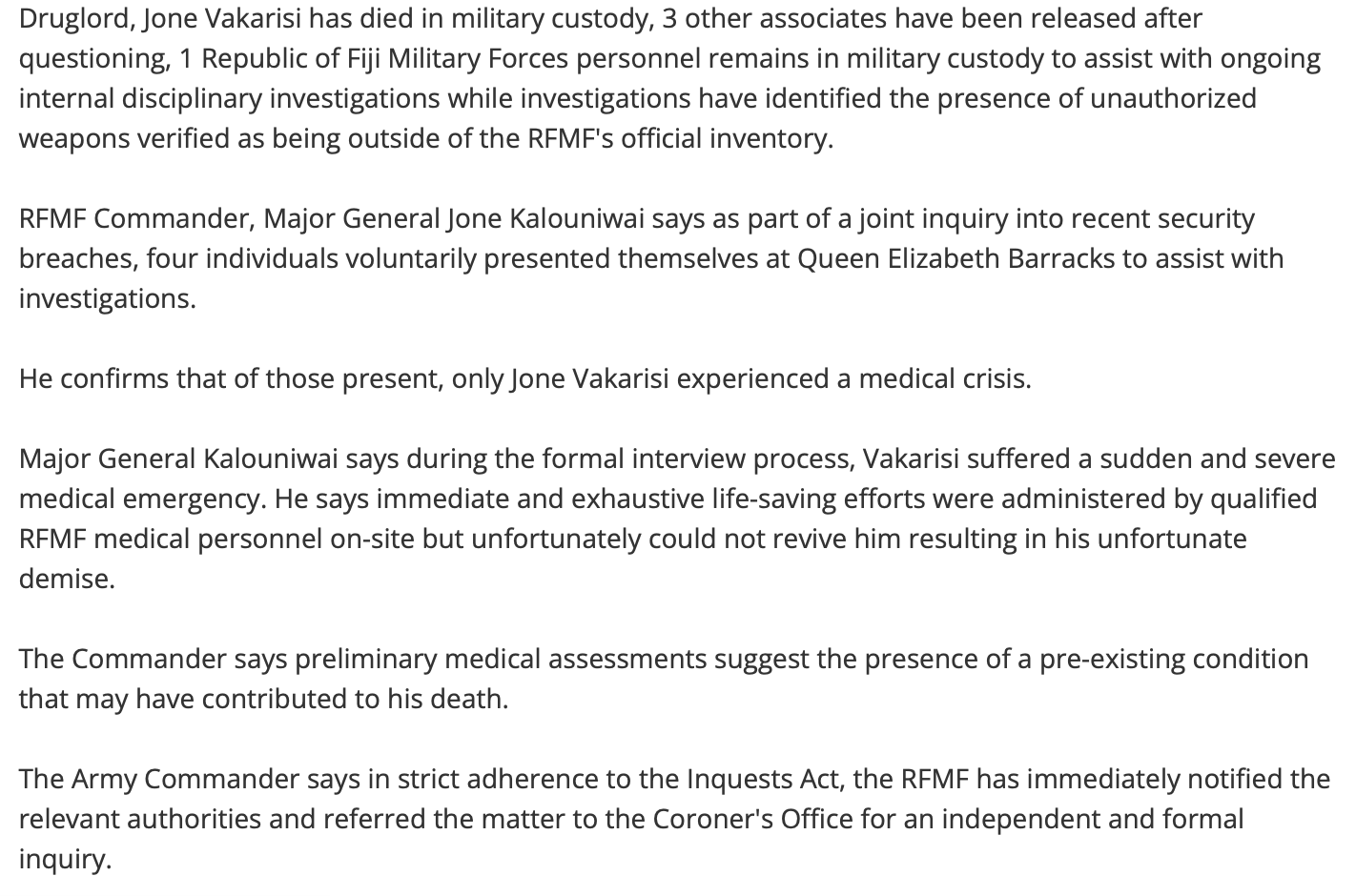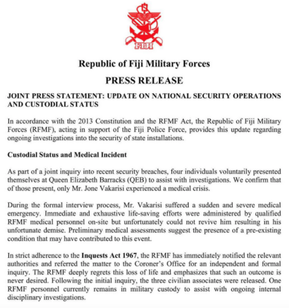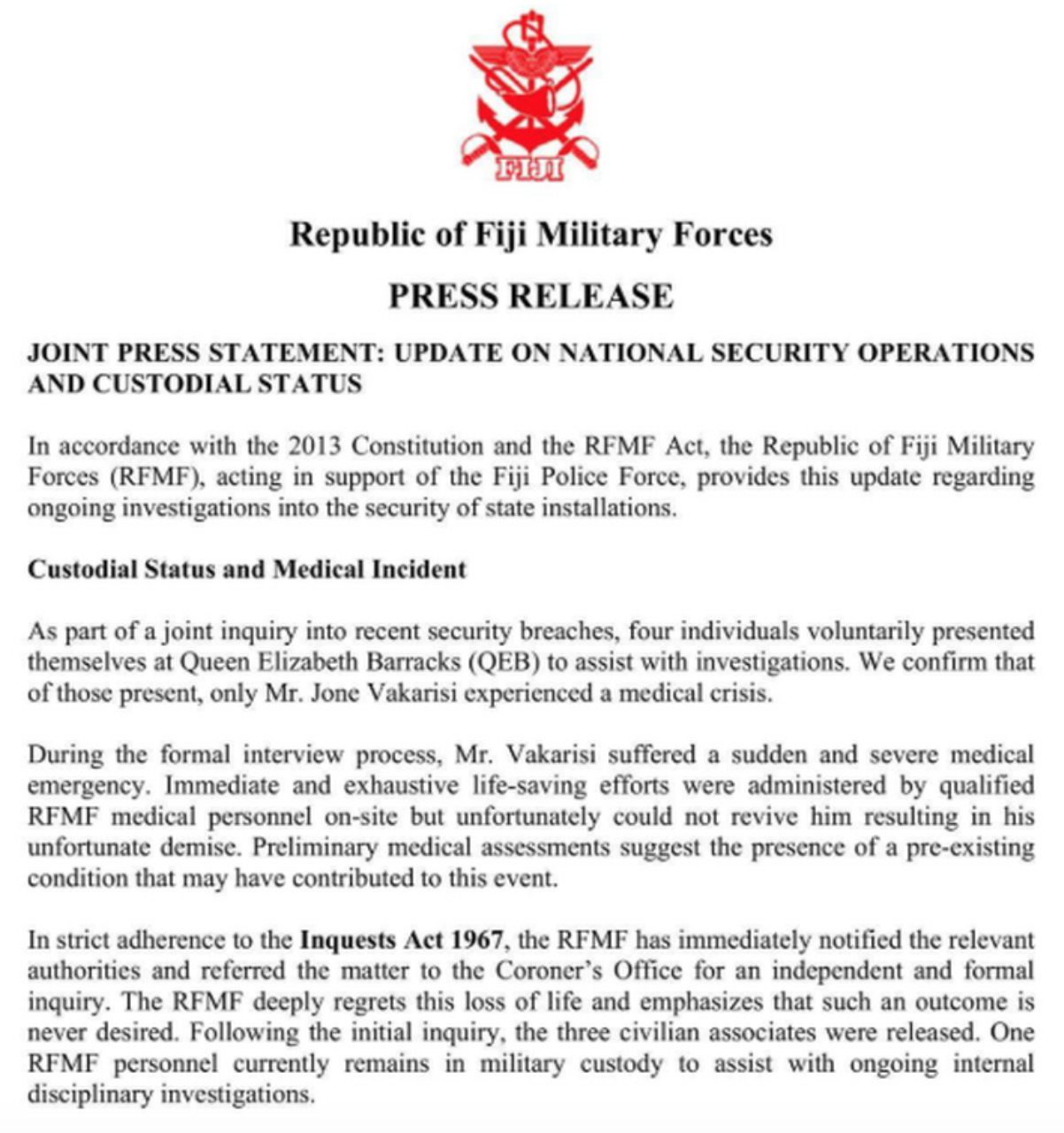 Here’s all the evidence you need to see, Fiji. First the statement from Major General Kalouniwai about the death of Jone Vakarisi.