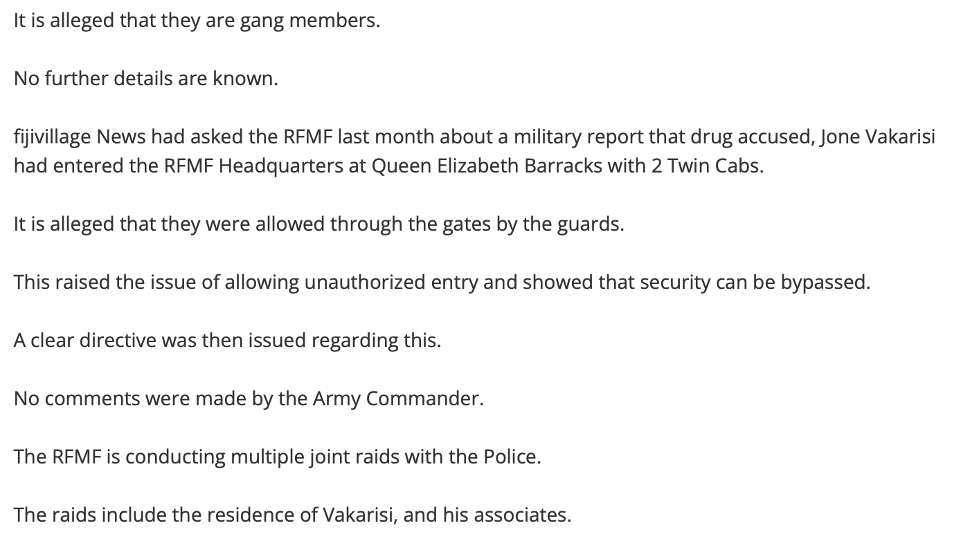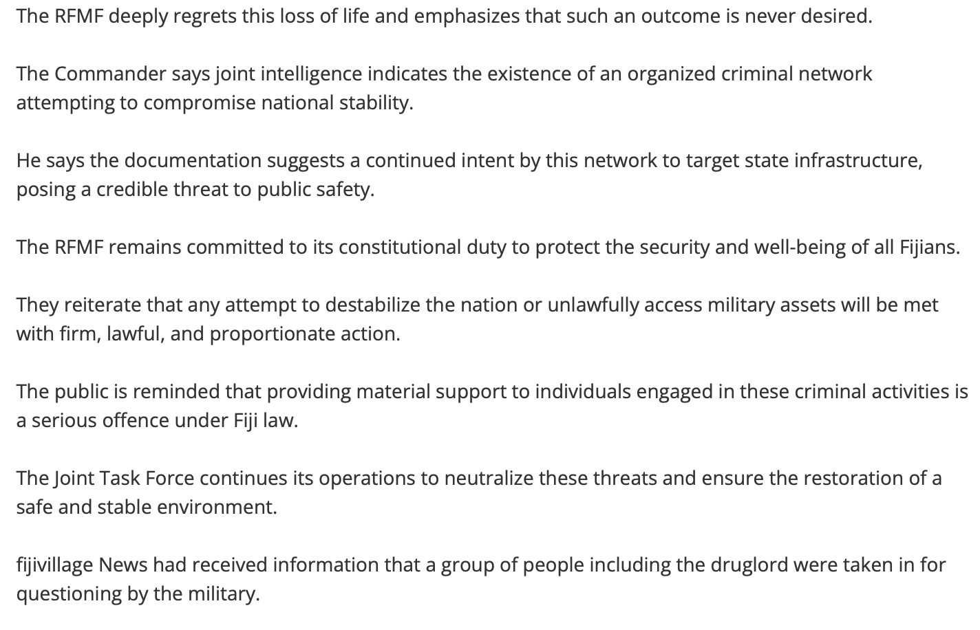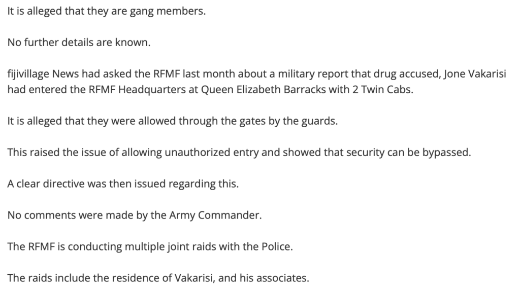 This is what I heard as well. If the plan to steal munitions had succeeded, and it was used to take the drugs from Vatia, the RFMF would have had to step in, leading to gunfighting in the streets of Suva, which is objectively a much worse scenario than what has occurred with the death in custody. And with the discovery of guns not from the RFMF armoury in the possession of drug gangs, this is still a stark possibility. None of this justifies a death in custody due to alleged brutality, but it is a reason nonetheless.