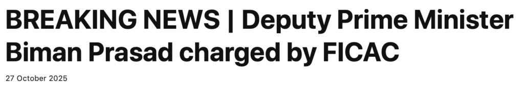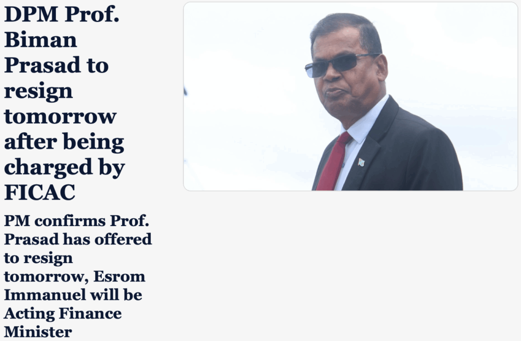 Biman Prasad – the NFP leader and Finance Minister – has joined his fellow deputy prime minister, Manoa Kamikamica, in being charged by FICAC with corruption-related offences and is expected to resign tomorrow (Tuesday).
