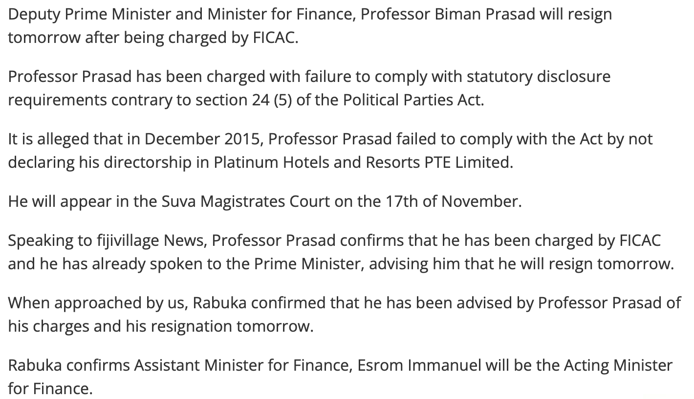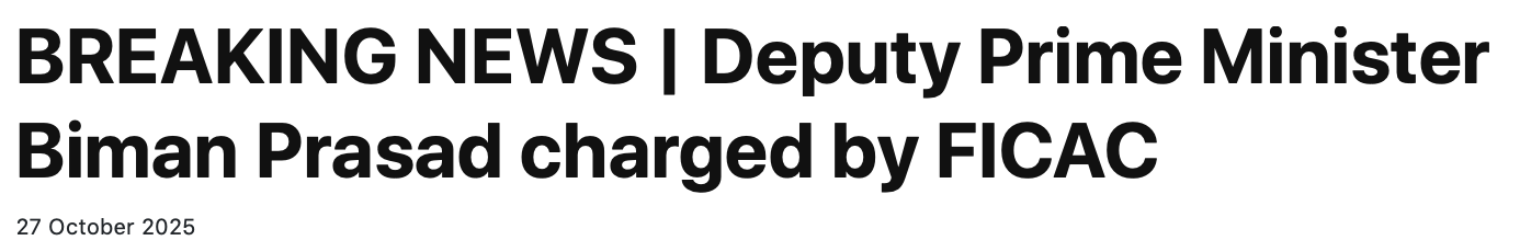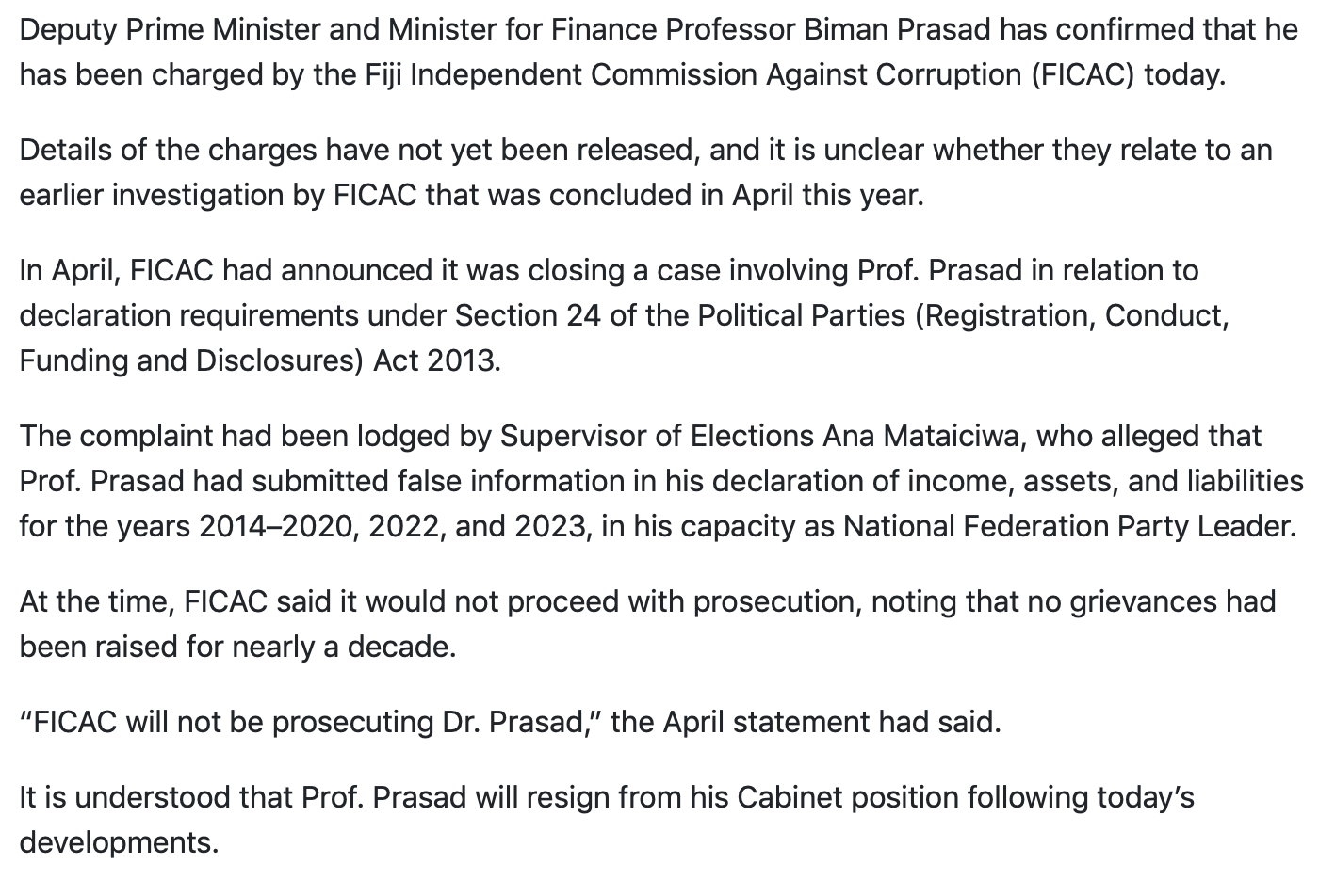 More details in due course. But we reiterate the same reminder we issued last week when Manoa Kamikamica was charged. The case of now sub-judice and Biman Prasad is entitled to be presumed innocent until proven guilty.