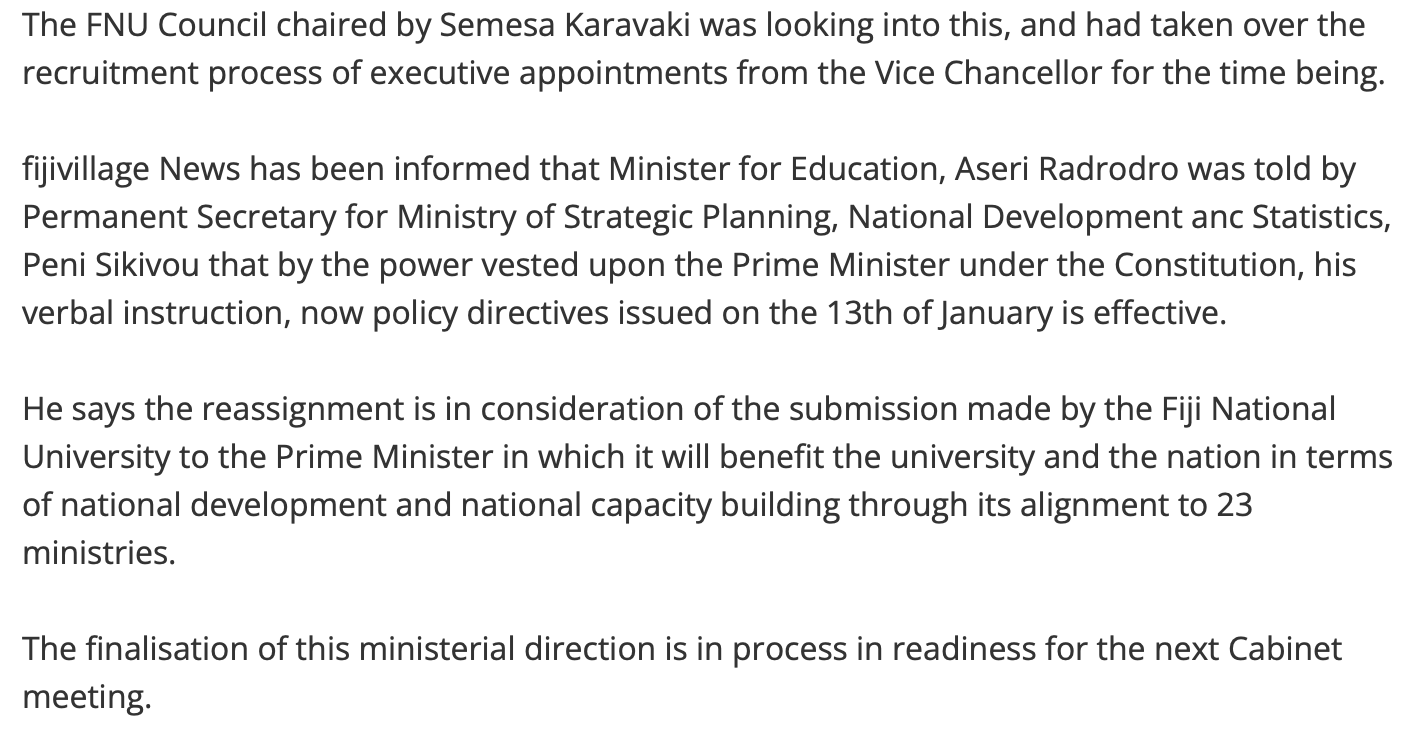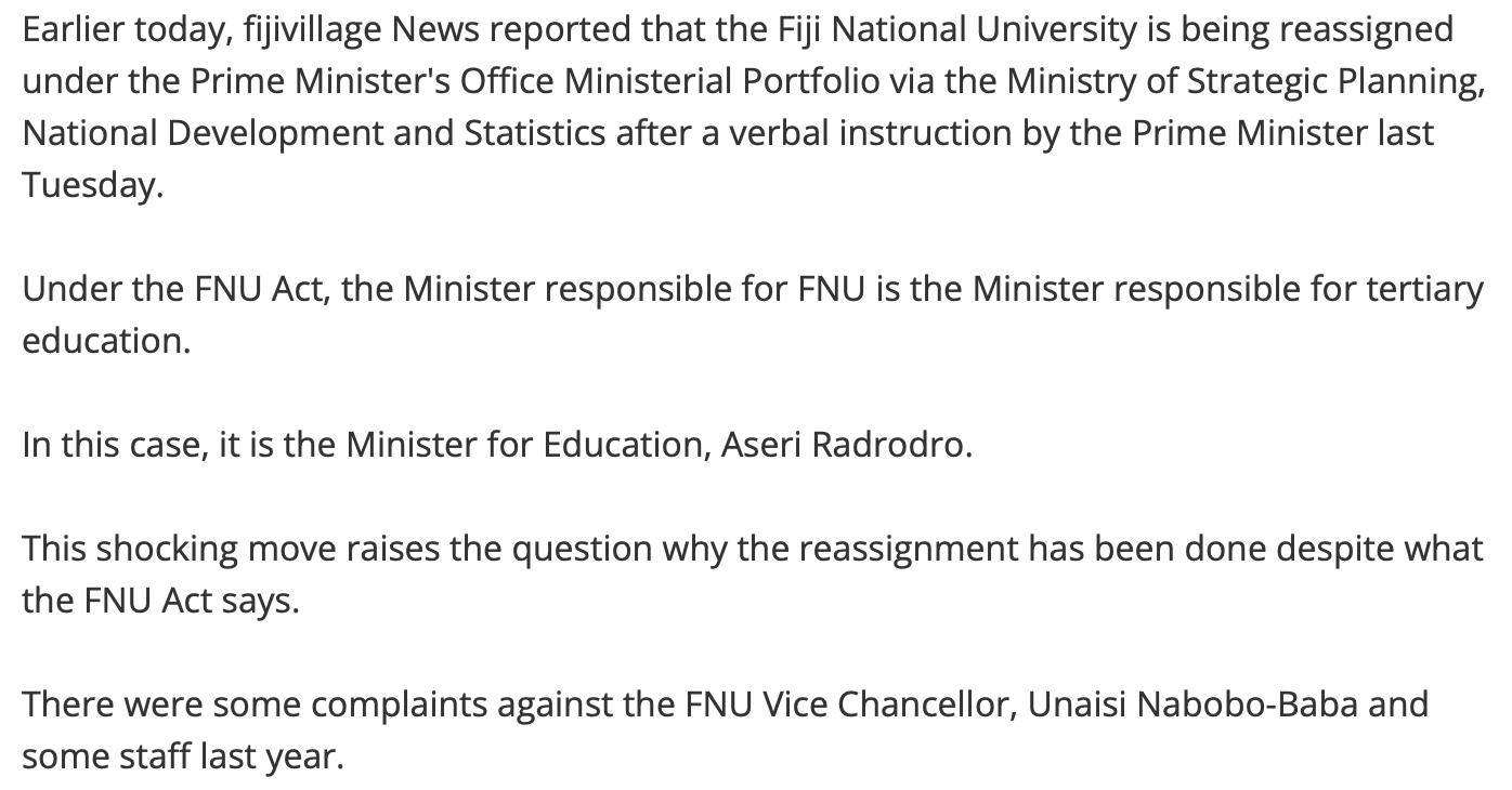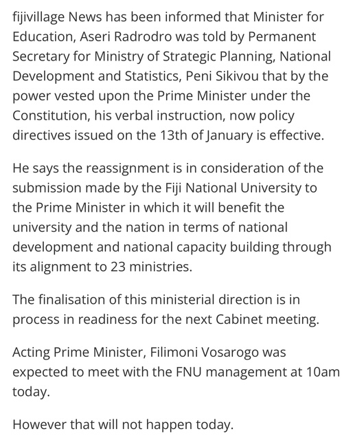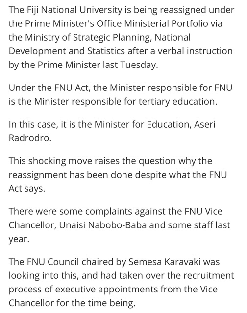 The Fiji National University Act is very clear. FNU falls under the Minister responsible for tertiary education. Right now, that minister is Aseri Radrodro. The Prime Minister cannot change this just by giving a verbal order. Only Parliament can change the law. No one, not even the Prime Minister, is above an Act of Parliament.