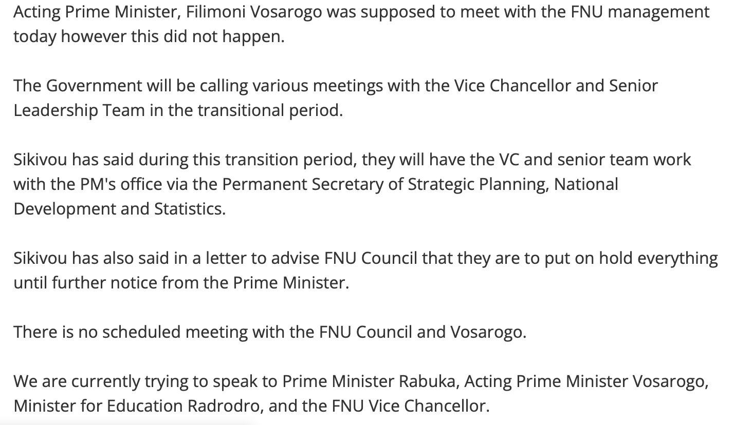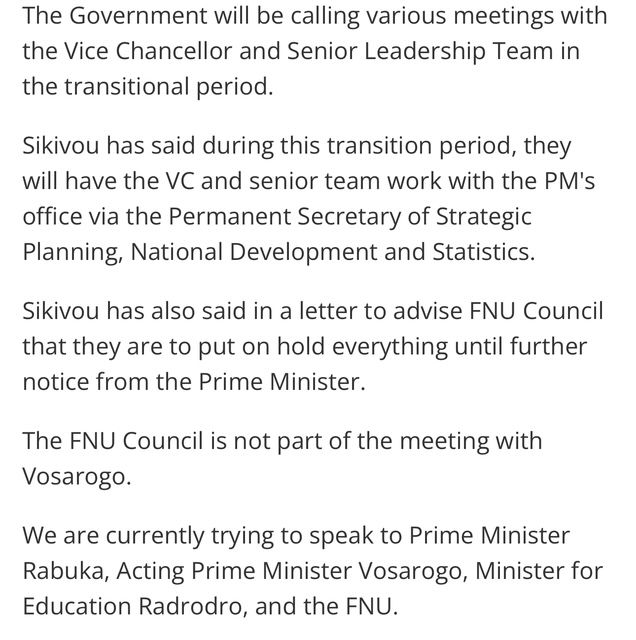 The FNU Council told to put everything on hold.The statutory Minister for Education effectively sidelined.