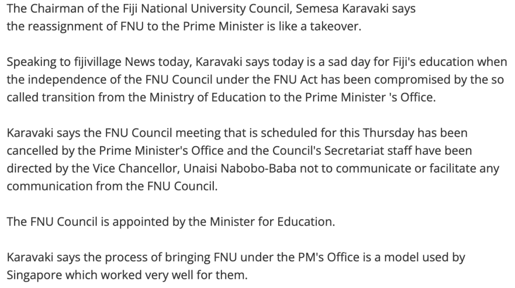 Vijay Narayan calls it a shocking move – the Prime Minister, Sitiveni Rabuka, seizing control of the Fiji National University from his Education Minister, Aseri Radrodro, in a manner that breaches all convention and has plunged the Coalition into yet another crisis.