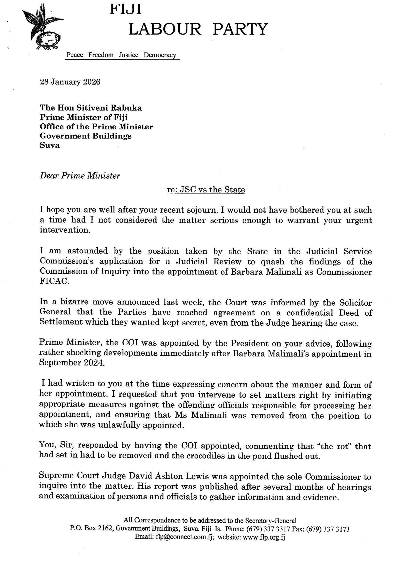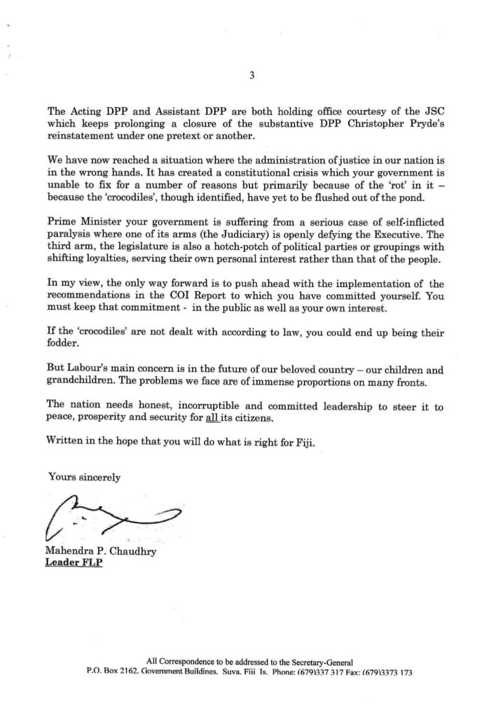 In the meantime, a letter has surfaced today from the former prime minister and Labour Party leader, Mahendra Chaudhry, to the Prime Minister, Sitiveni Rabuka, eviscerating him and the government for its handling of the CoI Report.
