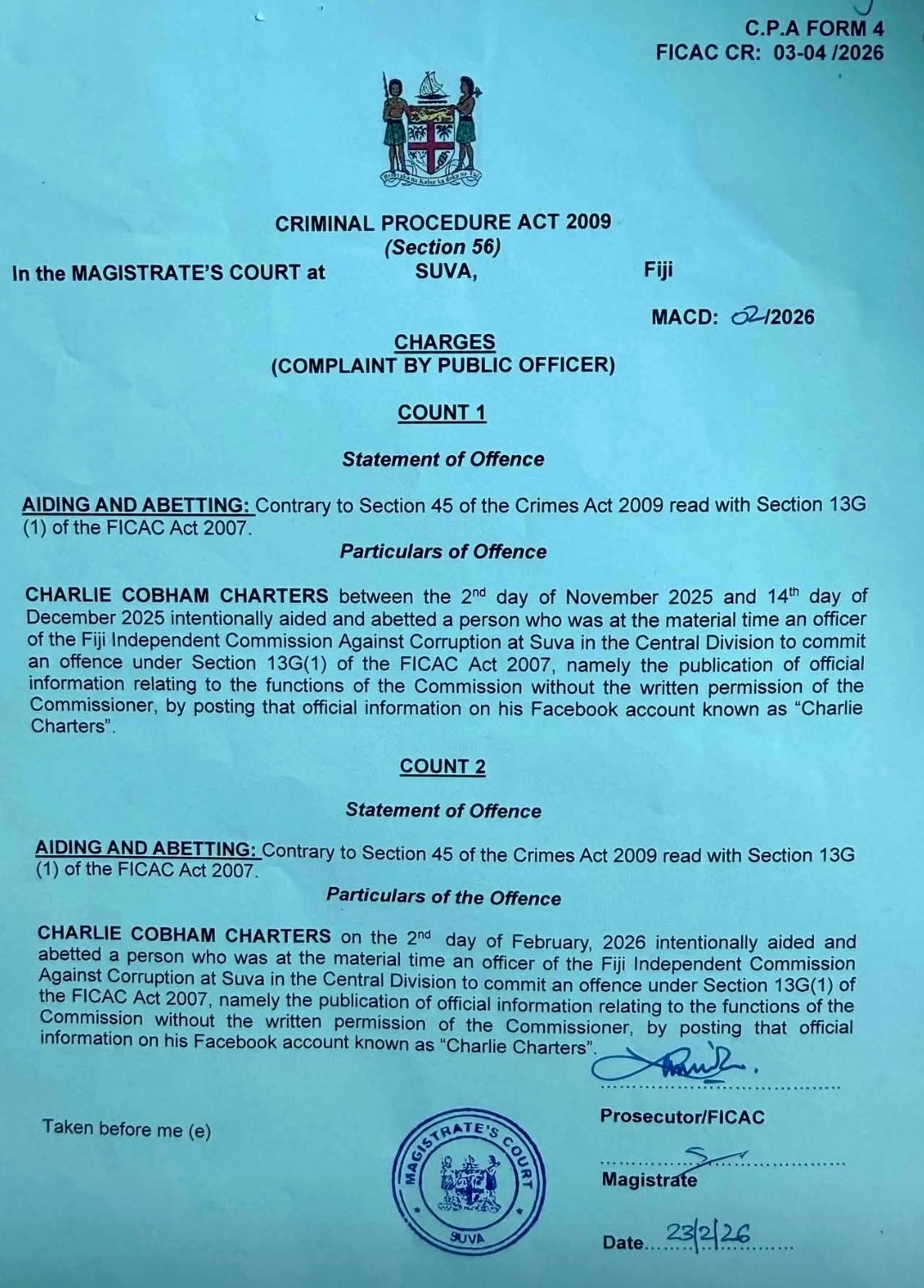 The “citizen journalist and publisher” Charlie Charters – who also happens to be Fiji’s latest fashion plate – has appeared in court charged with aiding and abetting an unnamed person at FICAC in violation of the Crimes Act.