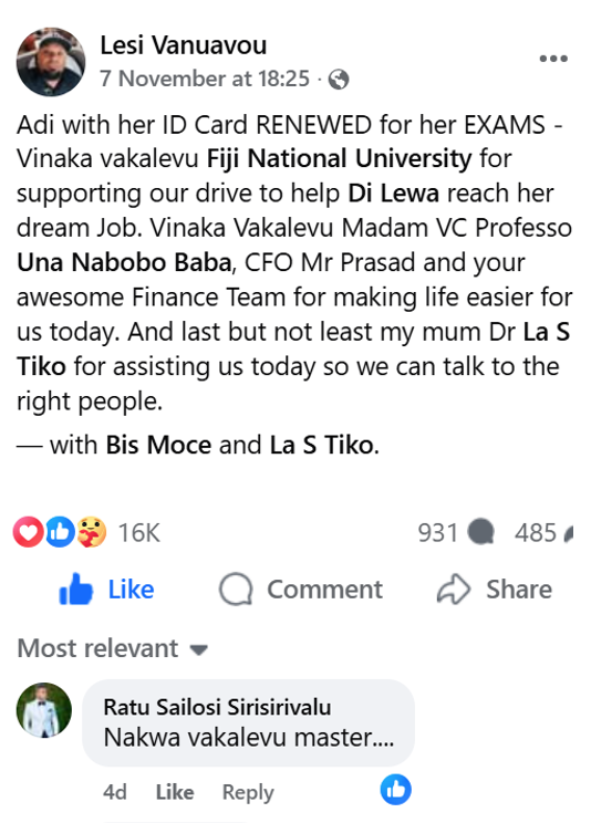 On Friday morning, Nov 7, 2025, Lesi Vanuavou and Bis Moce went live, interviewing Adi Lewa about her personal and financial struggles. The livestream went viral, watched by hundreds of thousands of viewers. Donors from all over the world pitched in and paid off the fees in less than 24 hours. People of all races and all occupations had helped a struggling villager from rural Tailevu. From America, Britain, Europe, Australia and New Zealand, everyone gave what they could.
