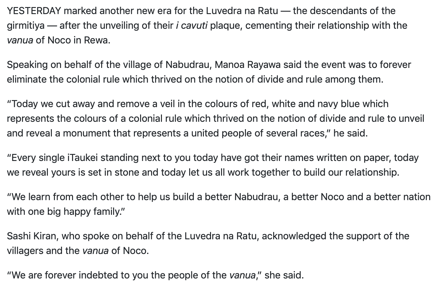 It also aligns with my experience, more than 50 years ago, of being a genuine vulagi, not born in Fiji, arriving in a small remote village. It bears mentioning that while I was in the privileged position of being a young vavalagi, close relatives in another village some distance away, had some 40 years,or possibly more before that, welcomed permanently into their village an escaped girmit,a starving and naked man who had been hiding in the bush and raiding their gardens.