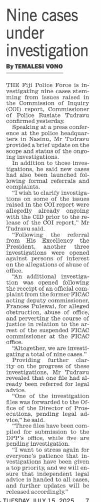 And here’s yet another travesty, Fiji – confirmation from the Police Commissioner, Rusiate Tudravu, that nine people are currently under investigation arising from the COI Report. And guess what? Those cases will ultimately be determined by Nancy Tikoisuva and John Rabuku at the ODPP.
