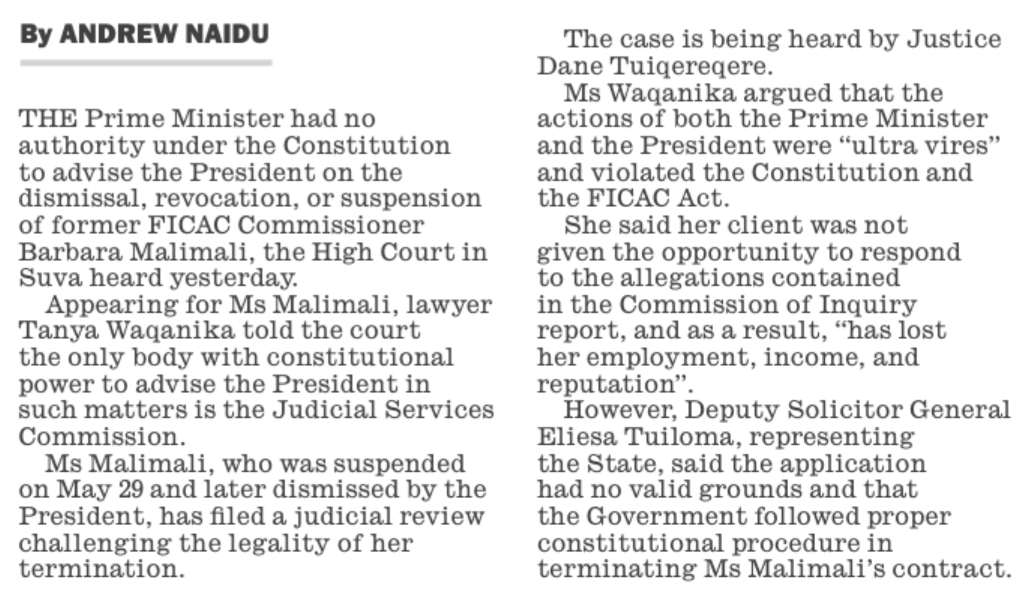The case is being rushed through the courts, despite a backlog of cases. This could only be achieved with the help of the CJ and the Chief Registrar, both clearly allies of Barbara Malimali and who have also been found by the COI to have acted contrary to the laws of Fiji and accused of attempting to pervert the course of justice.