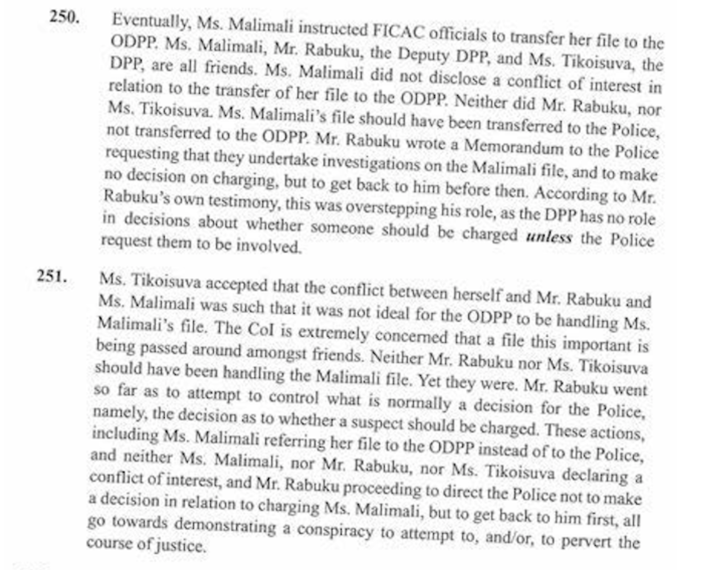 The case is being rushed through the courts, despite a backlog of cases. This could only be achieved with the help of the CJ and the Chief Registrar, both clearly allies of Barbara Malimali and who have also been found by the COI to have acted contrary to the laws of Fiji and accused of attempting to pervert the course of justice.