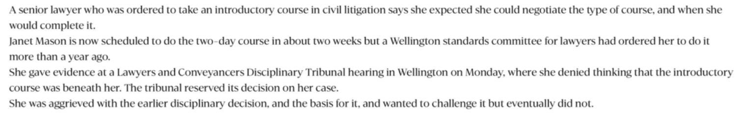 Janet Mason is now scheduled to do the two-day course in about two weeks but a Wellington standards committee for lawyers had ordered her to do it more than a year ago.