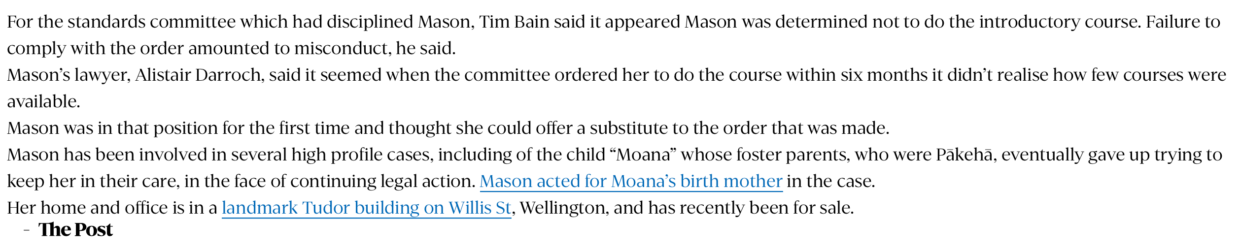 Mason has been involved in several high profile cases, including of the child “Moana” whose foster parents, who were Pākehā, eventually gave up trying to keep her in their care, in the face of continuing legal action. Mason acted for Moana’s birth mother in the case.