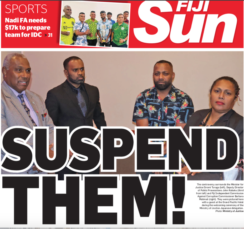 The Opposition leader, Inia Seruiratu, called for Barbara Malimali and John Rabuku to be suspended when they were photographed with the Minister for Justice, Siromi Turaga, at a function at the GPH last month. He did so on the basis that if Christopher Pryde could be suspended as DPP for being seen with Aiyaz Sayed-Khaiyum, the same should apply to Malimali – the investigated – and John Rabuku – the investigator.