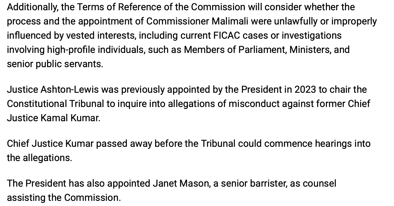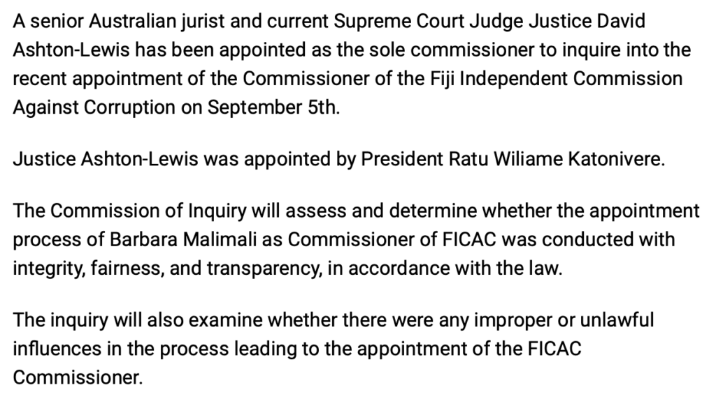 But can we have confidence in the forthcoming judicial investigation into the circumstances of Barbara Malimali’s appointment as FICAC Commissioner and the departure of Francis Puleiwai just as the Deputy Prime Minister, Biman Prasad, was about to be charged with abuse of office? It has now been three weeks since the investigation by the Australian Supreme Court judge, Justice David Ashton-Lewis, was announced and no further details have emerged.