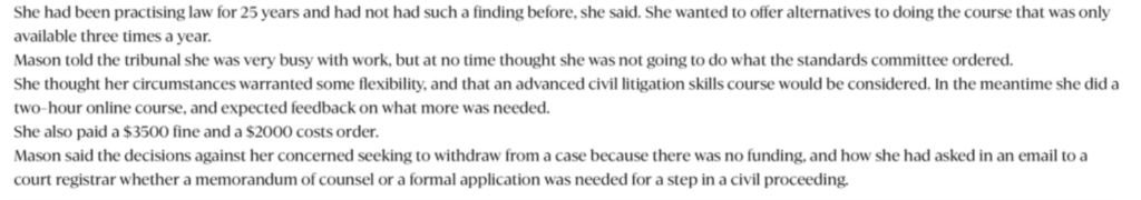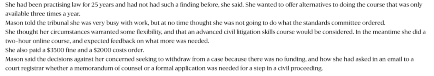 Mason said the decisions against her concerned seeking to withdraw from a case because there was no funding, and how she had asked in an email to a court registrar whether a memorandum of counsel or a formal application was needed for a step in a civil proceeding.